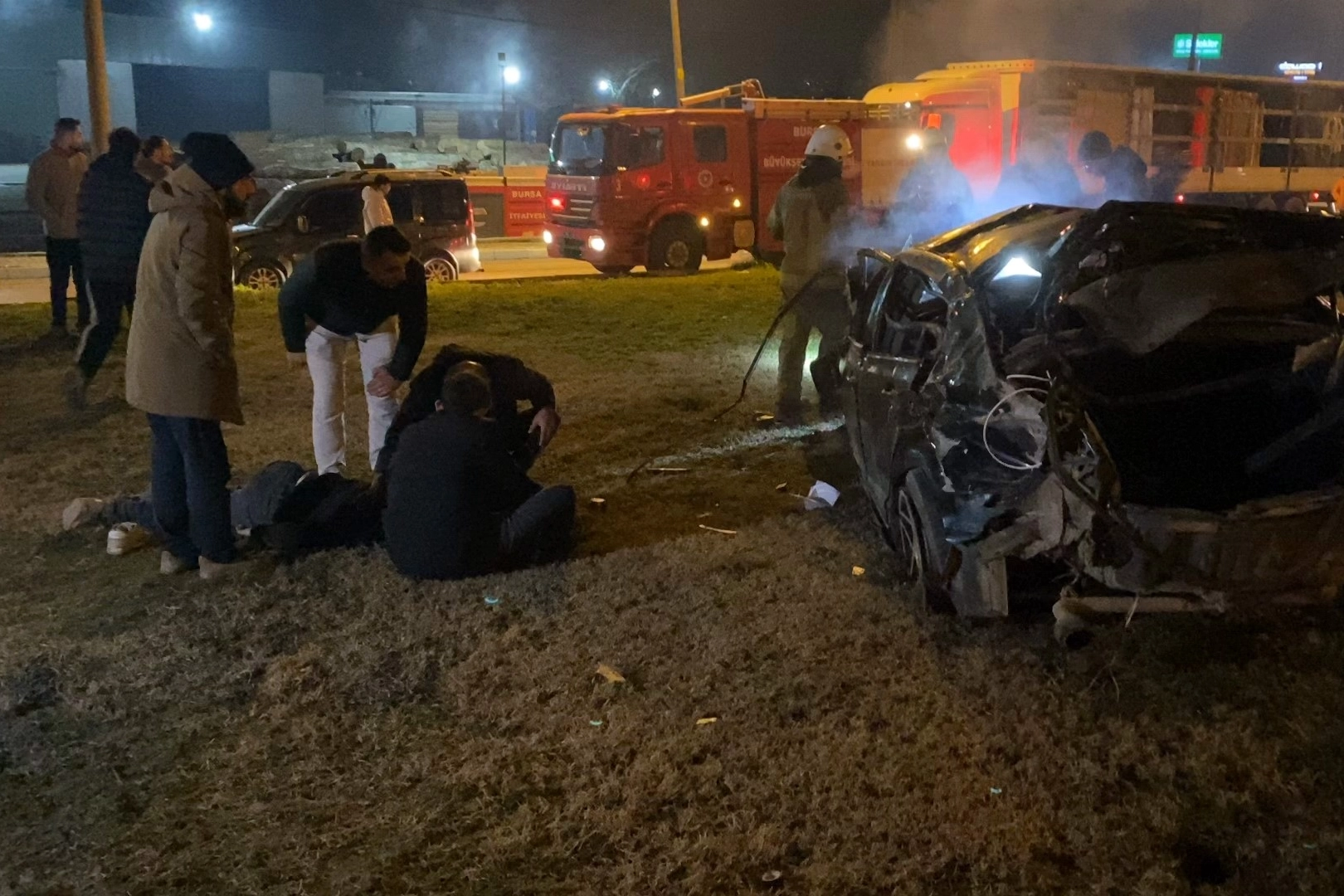 Kaza saat 22.30 sıralarında Bursa-Ankara karayolu üzeri Hikmet Şahin Köprülü Kavşağı girişinde meydana geldi. Selimcan P. (19) yönetimindeki 16 CDS 27 plakalı otomobil, sürücüsünün kontrolünden çıkarak önünde seyreden Volkan V. (38) yönetimindeki 43 AFL 997 plakalı otomobile arkadan çarptı. Çarpmanın etkisiyle taklalar atan araç yoldan çıkarak durdu. Taklalar atan araçtan fırlayan sürücü ile araçtaki yolcu Furkan K. (19) yaralandı. Yaralılar kaza yerine sevk edilen Ambulanslarla İnegöl Devlet Hastanesine kaldırıldılar. Polis kazayla ilgili soruşturma başlattı.