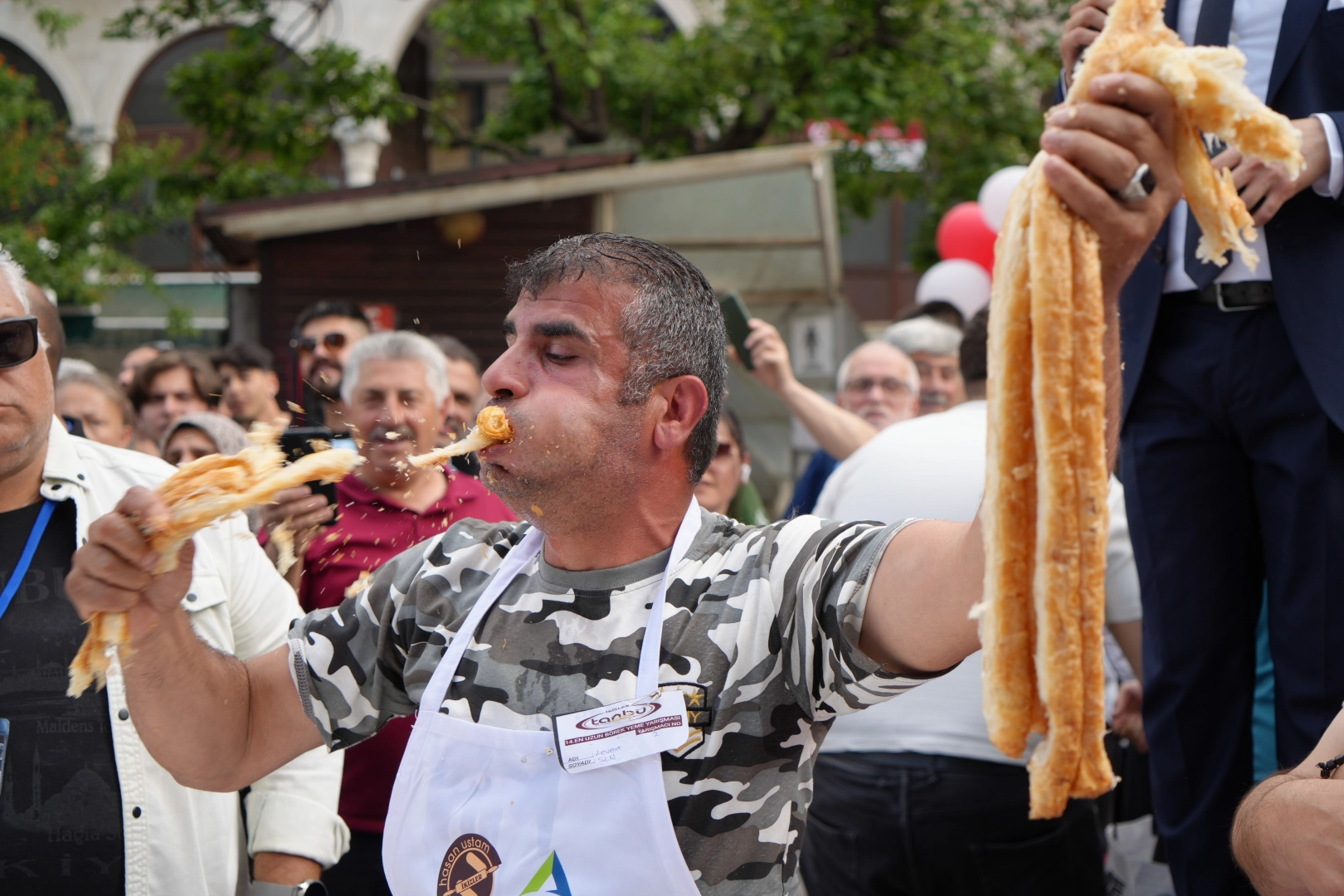 14. Geleneksel Börek Yeme Yarışması bu yıl Bursa'daki 15 Temmuz Demokrasi Meydanı'nda yapıldı. Yarışmaya katılan onlarca kişi, belirlenen 5.5 dakikada sürede en fazla böreği yemek için kıyasıya mücadele etti. 35 derece sıcakta ağızlıklarına tıktıkları börekleri yutabilmek için adeta savaş veren yarışmacılar sıcağın altında ecel terleri döktü. Zaman zaman baygınlık seviyesine gelen yarışmacılar başlarından aşağı su döküp börek yemeğe devam ettiler. Meraklı vatandaşların tezahüratlarıyla daha da gaza gelen bazı yarışmacılar ellerine aldıkları böreklerle masanın üzerine çıkıp şov yaptı. Renkli görüntülere sahne olan börek yeme yarışmasında birinci ikinci ve üçüncü olan yarışmacılar aynı uzunlukta 11'er metre börek yiyince devreye hassas terazi girdi. Yarışmacıların yemeden geride bıraktığı börek parçaları ile kırıklar hassas terazi ile tartılarak yarışmanın birincisi belirlendi. 584 gramla geride en az börek bırakan Ali Kılıç birinciliği kazanıp 10 gram altının sahibi olurken, 624 gram ile Fatma Arslan ikinci olup 5 bin lira, 700 gram ile Uğur Dündar ise üçüncü olup 2 bin 500 lira kazandı.