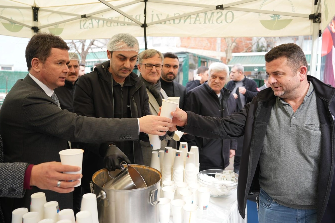 Cuma namazını Medine Camii’nde kılan Başkan Erkan Aydın, namaz çıkışında Mehmet Akif Mahallesi Muhtarı Osman Sakin ve belediye meclis üyeleriyle birlikte mahalle sakinlerine çorba ikram etti.