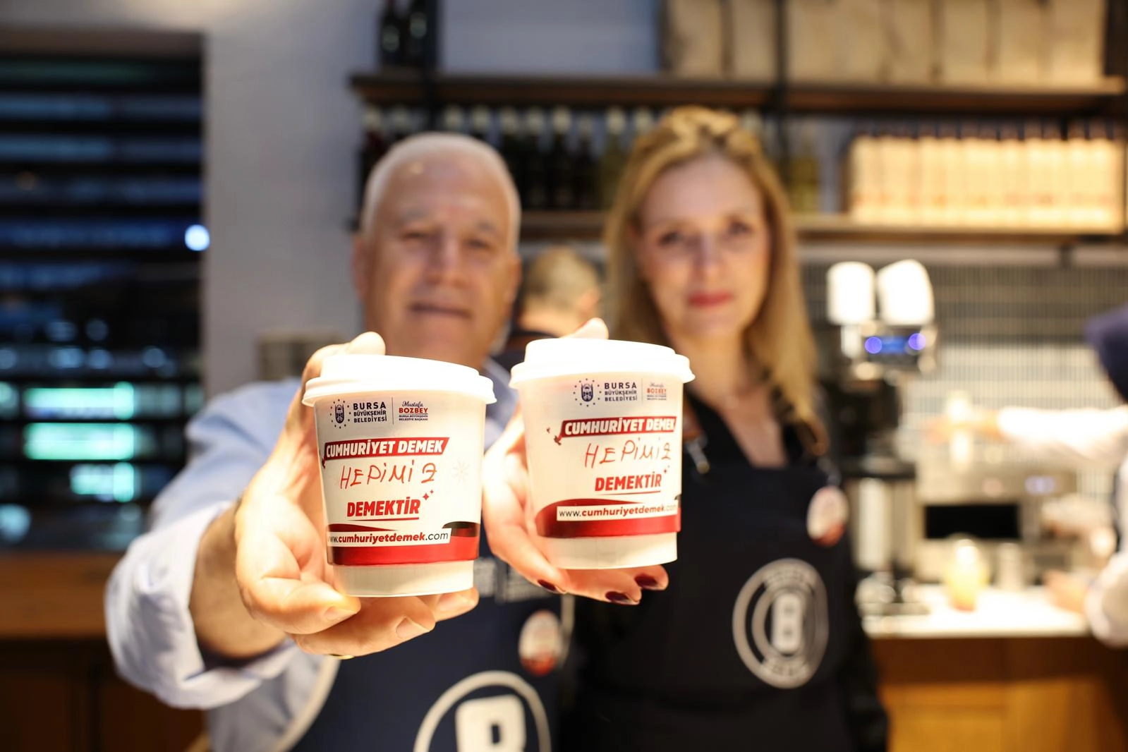 Eşi Seden Bozbey ile birlikte barista önlüklerini giyen Başkan Bozbey, Cumhuriyetin 102. yılına özel olarak hazırlanan ‘Cumhuriyet Demek’ temalı bardaklarda içecek ikramında bulundu. Vatandaşların isimlerini ‘Cumhuriyet demek' temalı bardaklara yazan Başkan Mustafa Bozbey ve eşi Seden Bozbey, Atatürk’ün emanet ettiği Cumhuriyet’in sıcaklığını Bursalılarla birlikte paylaştı. Bu sene kutlamaların teması olan ‘Cumhuriyet demek, hepimiz demek’ sloganını da yazarak ikramda bulunan Başkan Bozbey ve eşi Seden Bozbey, kahve keyfini vatandaşlarla birlikte yaşadı.