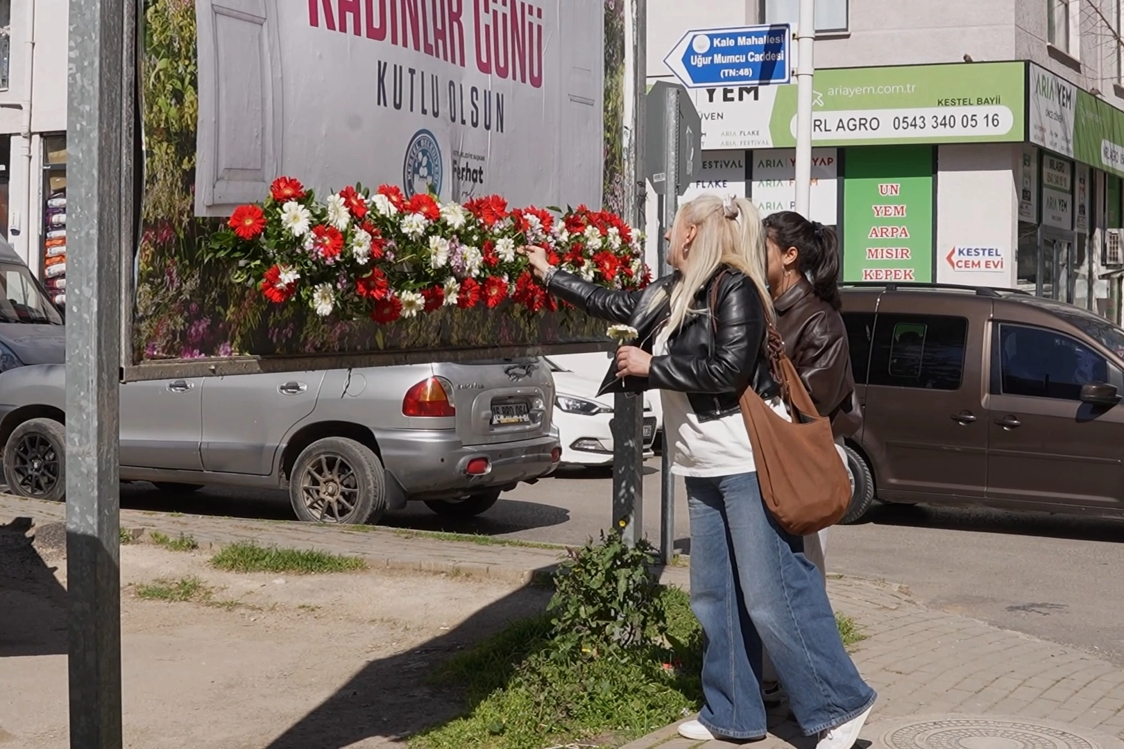 Kestel’in farklı noktalarına yerleştirilen çiçekler kısa sürede vatandaşların ilgisini çekerken, kadınlar hem şaşkınlık hem de mutluluk yaşadı. İlçede alışverişe çıkan, işe giden ya da günlük hayatını sürdüren birçok kadın billboardların önünde durarak kendileri için bırakılan çiçekleri aldı.