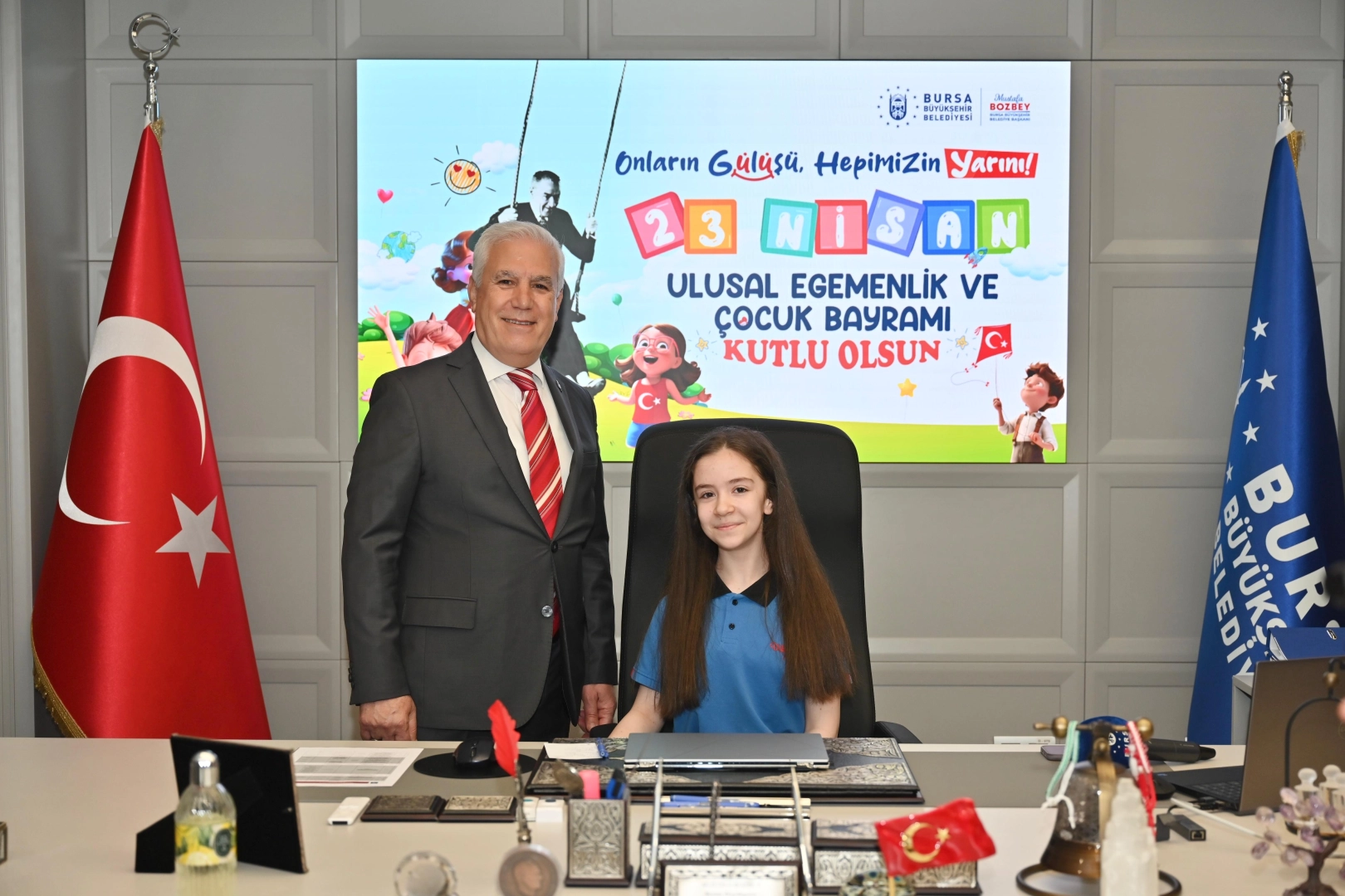23 Nisan Ulusal Egemenlik ve Çocuk Bayramı’nda, geleceğin ülke ve kent yöneticileri başkanlık koltuklarını devraldı. Bursa Büyükşehir Belediye Başkanı Mustafa Bozbey de koltuğunu Dilek Özer Ortaokulu 7. sınıf öğrencileri Duru Tuna ve İlke Ormancı’ya devretti. Bursa Büyükşehir Belediyesi Hizmet Binası’nda düzenlenen devir teslim töreninde, geleceğin başkanlarına Büyükşehir Belediyesi Genel Sekreter Yardımcısı Mehmet Yıldız, okul müdürü Tayfun Şahin, sınıf öğretmenleri ve aileleri de eşlik etti. Büyükşehir Belediye Başkanı Mustafa Bozbey’den görevi teslim alan Duru Tuna, ilk yapmak istediği hizmetin daha çok kütüphane açmak olduğunu söyledi. Kültür ve Sosyal İşler Dairesi Başkanı Şafak Baba Pala’yı telefonla arayan Tuna, Bursa’nın her semtinde kütüphane açılmasını istediğini dile getirdi. Daha sonra BURFAŞ Genel Müdürü Erhan Pınar’ı telefonla arayan geleceğin başkanı, BURFAŞ Kafe’lerin de kentin her bölgesinde çoğaltılması talimatını verdi. Daha sonra başkanlık koltuğuna oturan İlke Ormancı ise verimli Bursa Ovası’nın tarıma açılmasını istediğini belirtti. Üniversite öğrencilerine daha fazla yurt imkanı sağlanmasını da isteyen Ormancı, Bursa Yuvam’ın da sayılarının artırılması gerektiğini dile getirdi. Tarım Peyzaj AŞ Yönetim Kurulu Başkanı Mehmet Aydın Saldız’ı telefonla arayan Ormancı, fidan dikme etkinliklerinin artırılmasını talep etti.