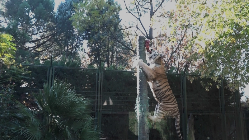 Bursa Hayvanat Bahçesi sakinleri, doğal ortamlarından farksız bir hayat sürüyor. Amur kaplanının tek sıçrayışta bakıcısının astığı eti kapması nefes kesti.