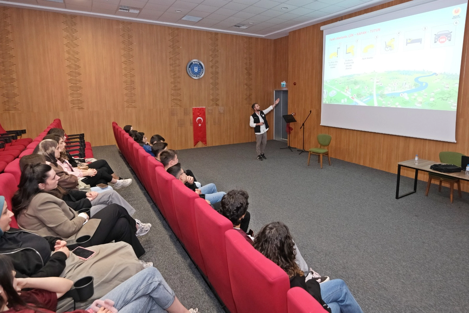 Bursa’nın daha dirençli, daha güvenli ve yaşanabilir bir kent olması için katılımcı bir anlayışla çalışmalarını sürdüren Büyükşehir Belediyesi, toplumun tüm kesimlerinde afet bilincinin oluşması için de eğitim programlarını sürdürüyor. Büyükşehir Belediyesi bünyesindeki Afet Koordinasyon Merkezi’nin (AKOM) uzman ekibi tarafından BUSMEK’in YKS Hazırlık Merkezlerinde gençlere afet farkındalık eğitimi verildi. Deprem öncesinde, sırasında ve sonrasında yapılması gerekenleri, toplanma alanlarının önemini, depremin neden olabileceği sorunları anlatan uzmanlar, afetlere karşı hazırlıklı olmanın önemini vurgulayarak neler yapılabileceğini aktardı.