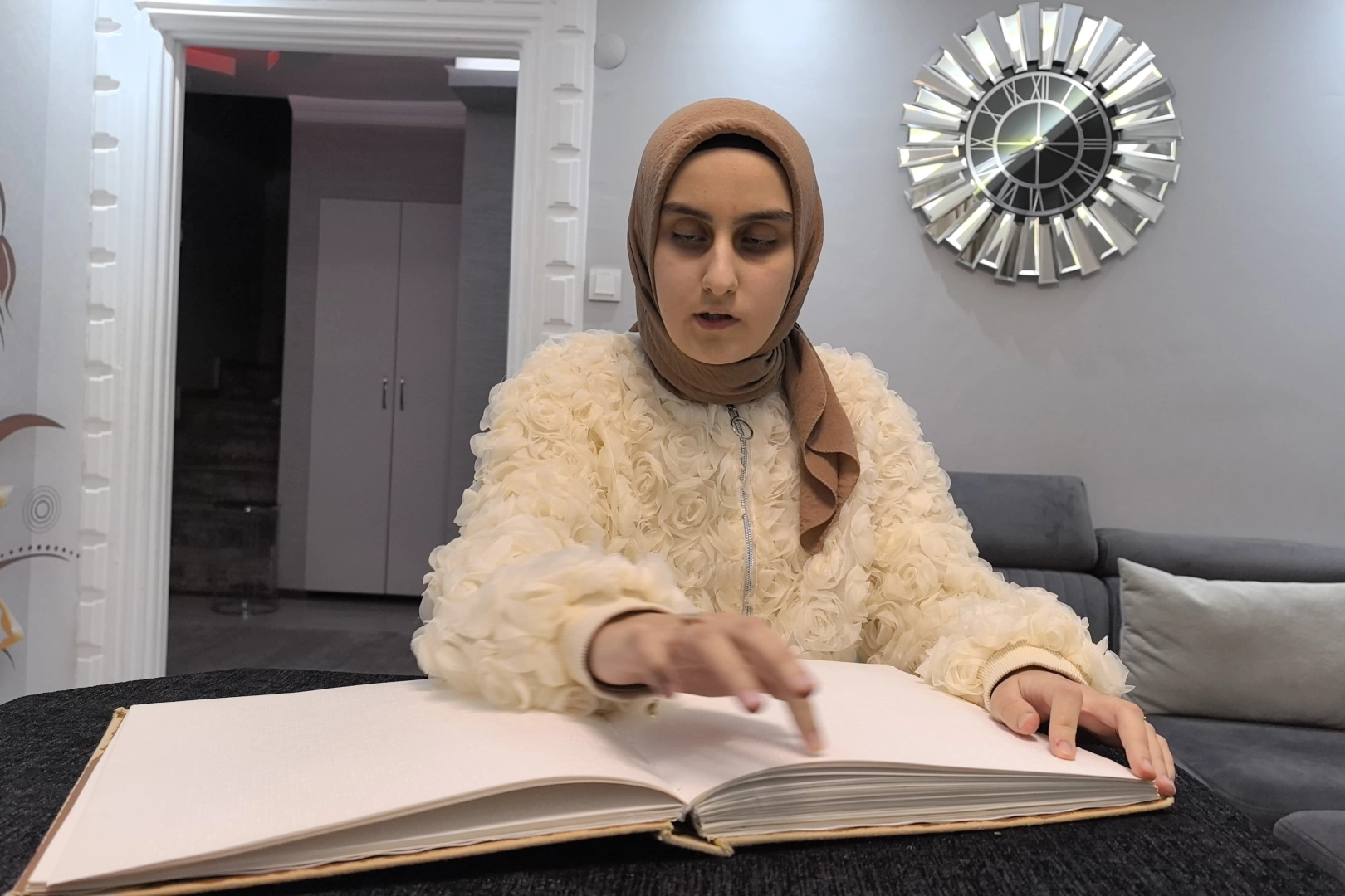 Medine Mevlütoğlu, "Ben küçük yaştan beri Kur'an aşkıyla büyütüldüm. Yani her zaman bu aşılandı bana. 8 yaşıma kadarki süreçte de her zaman babaanne, anneanne vesilesiyle Diyanet İşleri Başkanlığımız bünyesindeki birçok kursta eğitim alma fırsatı buldum fakat kabartma Kur'an-ı Kerim hani o zamanlar hem materyal yoktu, imkan yoktu. Öğrenememiştim. 8 yaşındayken hocalarım sağ olsunlar beni keşfettiler, sen öğrenebilirsin dediler. Bahriye hocamla iletişime geçtiler. Daha sonradan aile olarak iletişime geçtik, tanıştık ve kabartma Kur'an öğrenme sürecimiz başladı. Kısa bir süreçte Elif Ba cüzünü bitirdik ve Kur'an-ı Kerim öğrenmeye başladık, kabartma Kur'anla. Hocam sağ olsun çok yardımcı olmuştu o süreçte bana. Ve fark ettim ki Kur'an-ı Kerim benim hayatımı şekillendiriyor, ben onu hayat rehberi edinmeliyim ve daha fazla bu Kur'an-ı Kerim ile hemhal olmalıyım dedim fakat o zamanlarda maalesef böyle bir şey mümkün olmadı. Benim ortaokul sebebiyle Ankara'ya gitmem gerekti. Ankara'daki eğitimimde ne yazık ki ara vermek durumunda kaldım biraz ama sayın hocamla bağlarımızı hiçbir zaman koparmadık elhamdülillah. Ankara'dan döndükten sonra da Kur'an-ı Kerim eğitimime ara vermeden devam etmek istedim. Hem onu ezberlemek hem de anlamını içime işlemek istedim. Daha sonradan Bahriye Hocamın yanında Orhaniye Kuran Kursu'nda yine Diyanet İşleri Başkanlığımıza bağlı, hafızlık hazırlık eğitimi aldım. 30. Cüz, Yasin, Mülk gibi sureleri ezberlemek nasip oldu. Daha sonradan mart 2023 tarihinde İnegöl Merkez Hafızlık Kız Kuran Kursu'nda Hacer hocamın öğrencisi olarak hafızlığa başladım. Normalde 3 yıla kadar uzayan hafızlık sürecini 1.5 yıl gibi bir süreyle tamamlamak nasip oldu çok şükür. Hafızlık belgemin ardından öncelikle lise eğitimimi tamamlamak ve güzel bir İlahiyat fakültesinde eğitim almak istiyorum. Zira hedefim bu yönde. Daha çok Kur'an-ı Kerim ile hemhal olmak ve insanlarında hemhal olmasını sağlamak istiyorum inşallah. Daha sonra fıkıh ya da tefsir gibi alanlarda kendimi daha çok geliştirmek istiyorum. Hem diyanet bünyesinde öğretmenlik, hocalık yapmanın yanı sıra kendimi geliştirip üniversitelerde bir akademisyen bir profesör olarak da görev yapmak hedeflerim arasında aynı zamanda. Kendimi daha çok geliştirip fıkıh ya da tefsir alanında yeni öğrenciler yetiştirmek, insanları bu konuda bilgilendirmek hedeflerim arasında. Daha öncelerde de kendisiyle tanışmış bulunduğumuz, kendisine piyano çalmış bulunduğum sayın Cumhurbaşkanımız Recep Tayyip Erdoğan'ın elinden de temmuzda gireceğim sınavdan inşallah elde edeceğim belgeyi almak istiyorum. Ben hafızlık sürecimde aynı zamanda İngilizce eğitimi de alıyordum. Bir ilerleme kaydetmiştim fakat benim kurum bitti. O zamanlarda belli bir seviyeye gelmiştim, o seviyenin bitişiyle beraber ben akademiden ayrıldım. Fakat cambly programında haftanın 3 günü anadili İngilizce olan eğitmenlerle yine eğitimime devam ediyorum. Aynı zamanda İmam Hatip Lisesi öğrenci olmam sebebiyle de Arapça öğreniyorum. Kendi kendime Fransızca öğrenmemin yanı sıra annem sağ olsun Rusça öğrenmeme de katkı sağlıyor. O yüzden hem dil hem de daha önce de bahsettim Cumhurbaşkanımıza piyanoda çalmıştım. Aynı zamanda piyano eğitimime de devam ediyorum. Bu süreçte de hafızlığımı tamamladım" dedi.