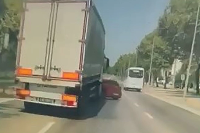 Kaza, Bursa'nın en işlek Ata Bulvarında meydana geldi. Bir aracın kamerasına yansıyan görüntülerde, şeritlerinden hareket eden araçlar, lambalardan geçince yön değiştirmek istedi. Sol şeritten ilerleyen tır, beyaz otomobilin çerçevesini orta şeride geçmek istedi. Ancak orta şeritte kör aralıkta kalan kırmızı araç fark etmedi. Yön Sağın kırılmasıyla birlikte, kırmızı araç tırın önünü yan dönerek sürüklenmeye başladı. Kısa bir süre sonra otomobili fark eden tır sürücüsü durdu. Yaşanan kaza anı saniye saniye araç içi kameraya yansırken, görünen kazada yaralanan olmuyor.