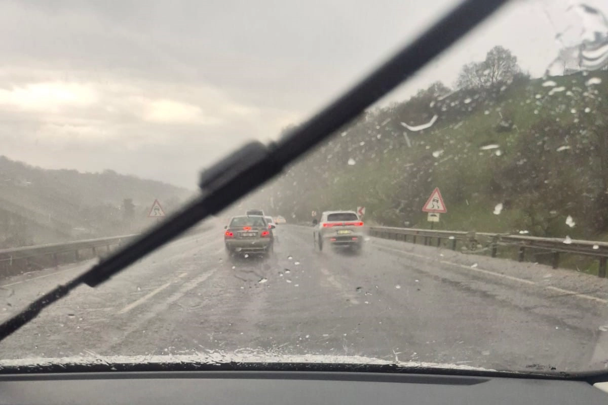 Bursa-Ankara karayolunun Kestel ilçesi Ümitalan rampası mevkiinde etkili olan yoğun dolu yağışı sürücülere zor anlar yaşattı. Sürücüler, araçlarını yol kenarına park edip yağışın bitmesini bekledi.