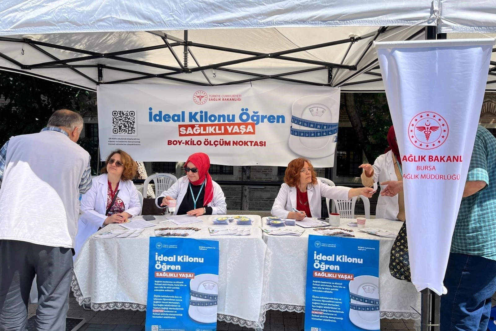 İl sağlık müdürlüğü ekipleri tarafından, Bursa’daki park ve meydanlarda kilo ölçümü yapılan vatandaşlardan vücut kitle endeksi riskli olanları sağlıklı hayat merkezlerine yönlendiriliyor.