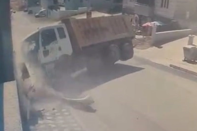Bursa'nın İnegöl ilçesinde freni patlayan kum yüklü kamyon, sitenin duvarına çarpıp devrildi. Sürücünün yaralandığı kazada bir vatandaş ise saniyelerle kurtuldu.