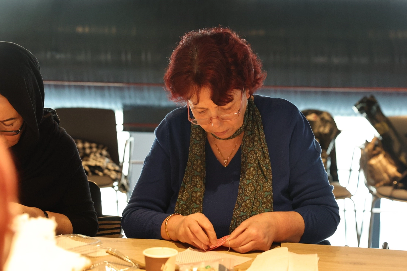 Atölyede, kadınlar kapı süsü yapımında eski kumaşları kullanarak, geri dönüşüm ve sürdürülebilirlik konusunda da farkındalık oluşturdu.