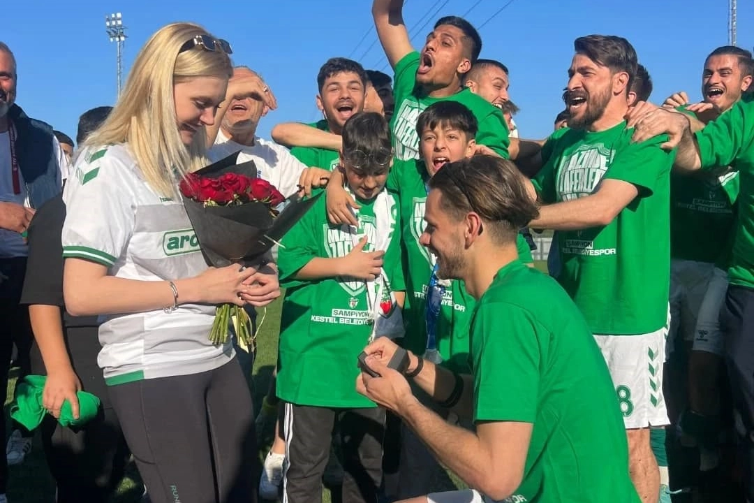 Kestel Belediyespor geçtiğimiz pazar günü Atıcılar Veysel Karani Sahası'nda oynanan Küplüpınar Yeşildağspor karşılaşmasını 3-0 kazanarak adını Bölgesel Amatör Lig'e (BAL) yazdırdı. Kestel Belediyespor forması giyen 24 yaşındaki tecrübeli kanat oyuncusu Hafız Görkem Vardar, maçın bitiminde kız arkadaşına sahada evlenme teklifinde bulundu. Evet cevabının ardından takım arkadaşları tarafından alkışlarla tebrik edilen genç çift, evlilik yolunda ilk adımı yeşil sahalarda atmış oldu.
