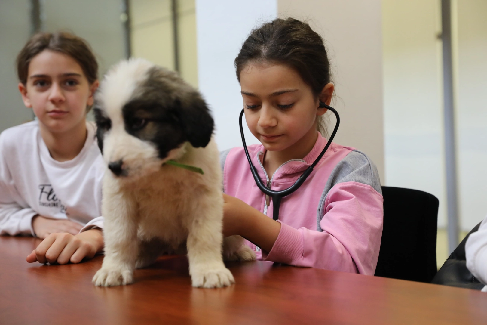 Daha sonra veteriner hekimler tarafından getirilen köpek ve tavşan ile de uygulamalı etkinlik gerçekleştirildi. Hayvanların nasıl muayene edildiğini öğrenme imkanı bulan çocuklar, köpek ve tavşanı yakından görme, tanıma ve sevme fırsatı buldu. Veteriner hekimlere merak ettikleri soruları da yönelten çocuklar, keyifli ve öğretici bir gün geçirdi.