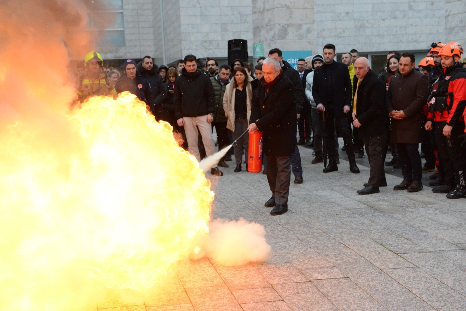 Başarılı şekilde gerçekleşen bina tahliyesinin ardından açık alanda kuru kimyevi tozla yangın söndürme tatbikatı yapıldı. Konuyla ilgili bilgilendirmenin ardından bina dışında uygulama gerçekleştirildi. Başkan Şadi Özdemir de yangın söndürme uygulaması yapanlar arasında yer aldı.