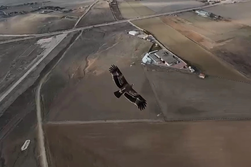 Bursa'da arazide çekim yapan dron, o sırada havada olan şahinin radarına takıldı. Meraklı şahin, uzun süre dronun etrafında döndü. O anlar dron kamerasına yansıdı.