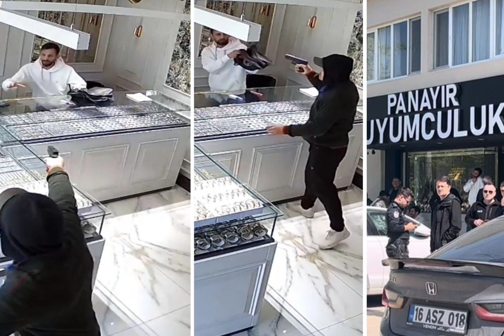 Bursa’nın merkez Osmangazi ilçesi Panayır Mahallesinde bulunan bir kuyumcuyu soymak için gelen şüpheli selam vererek girdiği dükkanda silah çekip, kuyumcunun önüne çanta attı. Altınları doldurmasını isteyen kuyumcuyla bağrışan soyguncu, kuyumcunun arka bölümden içeri giren kardeşinin "sakin sakin" demesine aldırmadı. Bağrışmalar üzerine panikleyen şüpheli, giderayak kuyumcuya ateş açtı. Para sayma makinasına isabet eden kurşun nedeniyle yara almayan kuyumcu, panik butonuna basıp 112 ekiplerinden yardım istedi. Korku dolu anlar güvenlik kamerasına saniye saniye yansıdı. Ekipler, o şüpheliyi yakalamak için geniş çaplı çalışma başlattı.