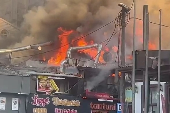 Bursa’da tarihi Setbaşı semti Karaağaç Mahallesi’nde Bursa’nın simgelerinden olan Mahfel’in yanında bir dönercide yangın çıktı. Bilinmeyen bir nedenden çıkan yangın tüm dükkanı sararken alevler bitişiğinde bulunan ekmek fırınına da sıçradı. Çevredeki vatandaşların ihbarı üzerine olay yerine polis ve itfaiye ekipleri sevk edildi. İtfaiye ekipleri alevlerin diğer tarihi binalara sıçramaması için önlem alırken polis ekipleri de çevredeki kalabalığı uzaklaştırdı. Ekiplerin yangına müdahalesi sürerken, çevrede geniş güvenlik önlemleri alındı. Öte yandan yangın anı, cep telefonu kamerasına yansıdı.