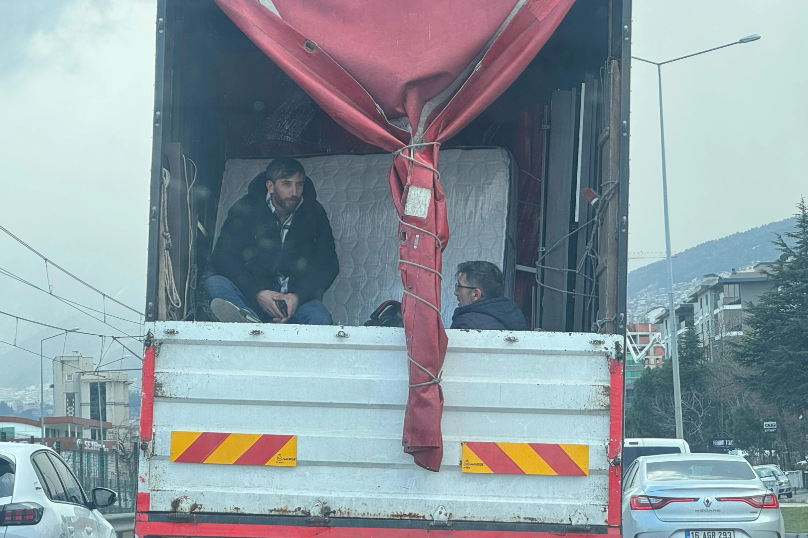Soğuk havaya aldırış etmeden Bursa yolu üzerinde seyreden açık kasa kamyonetin kasasına binen işçiler, yoldan geçen diğer otomobillerin kornalı ikazına da aldırış etmedi. Canlarını hiçe sayan işçilerin tehlikeli anları, saniye saniye kameralara yansıdı.