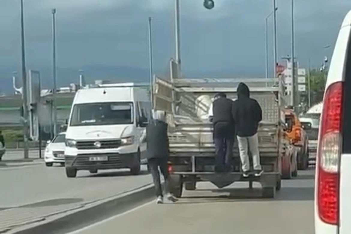 Olay, merkez Osmangazi ilçesi Sanayi Caddesi'nde meydana geldi. 3 genç, canlarını hiçe sayarak açık kasa kamyonetin arkasına tutundu. Bu şekilde seyahat eden gençlerin tehlikeli yolcuğu, amatör kamera ile saniye saniye kaydedildi.