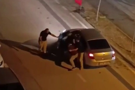 Olay, Nilüfer ilçesi Akçalar Mahallesi’nde meydana geldi. Edinilen bilgiye göre, trafikte henüz bilinmeyen bir nedenle bir otomobil sürücüsü ile tartışan iki kişi, aracı durdurup kavgaya tutuştu. Yumruk ve tekmelerin havada uçuştuğu kavgayı gören çevredeki vatandaşlar, tarafları ayırmak için büyük çaba gösterdi. O anlar, cep telefonu kamerasıyla kaydedildi. Görüntülerde, iki kişinin birbirine defalarca yumruk attığı, çevredekilerin ise güçlükle müdahale ettiği anlar yer aldı.