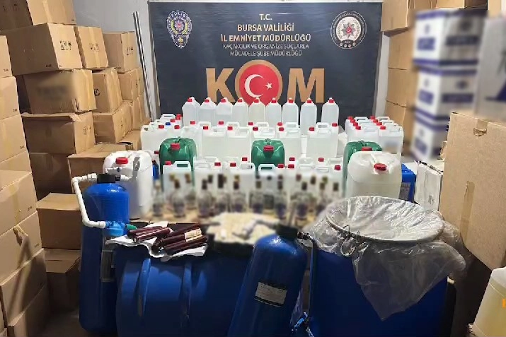 Bursa Cumhuriyet Başsavcılığı koordinesinde, Bursa Kaçakçılık ve Organize Suçlarla Mücadele (KOM) Şube Müdürlüğü ekiplerince il genelinde sahte alkollü içki ticareti yapan şüphelilere yönelik operasyon gerçekleştirildi. Yapılan operasyonda 4 bin 735 litre etil alkol, 2 bin alkol aroması, 350 adet sahte bandrol, 320 adet alkol kapüşonu, 820 adet etiket, 35 adet boş şişe, 8 adet gümrük kaçağı alkollü içki, 1 adet su pompası, 4 adet oksijen tüpü, 3 adet filtre, 300 litre boş tank, 1 adet tüfek ile 17 kartuş ele geçirilirken 9 şüpheli de yakalandı. İfadesi alınmak üzere emniyete götürülen 9 şüpheliden 8'i işlemlerinin ardından adliyeye sevk edildi. Hakim karşısına çıkan şüphelilerden U.K., B.A., B.E., M.S., S.K., G.U. ve E.C. isimli 7 şahıs tutuklanırken, İ.D. ise adli kontrol şartıyla hastaneye sevk edildi. Bursa Emniyet Müdürlüğü yaptığı açıklamada, "Alkollü içki imal ederek piyasa sürmek suretiyle insan sağlığına zararlı etkileri olan ve hatta ölümlere yol açabilen sahte alkollü içkiler üzerinden haksız kazanç elde edilmesinin engellenmesi için mücadelemiz kararlılıkla sürecektir” ifadeleri kullanıldı.