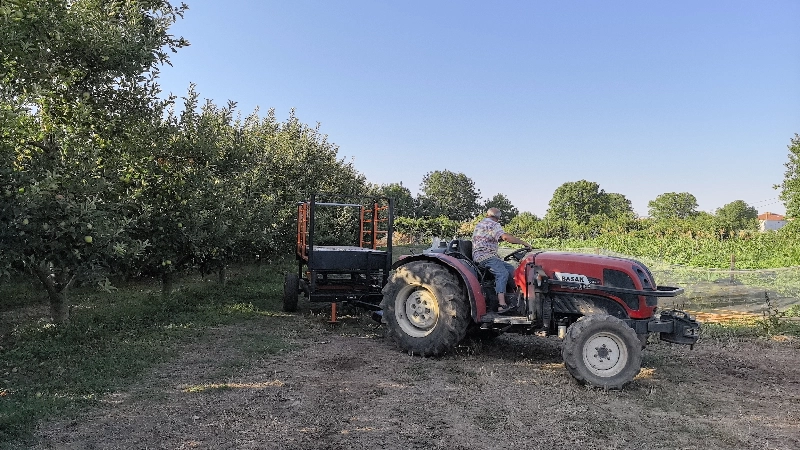 Çiftçi Mehmet Alkan 3 yıl boyunca kafasında tasarladığı sistemi 15 gün içinde gerçekleştirdi. Oğlu Kağan Alkan'ın metal atölyesinde montajını yaptığı ve torunu Atlas'ın ismini verdiği ürün hasadı için kullanılan asansörle hasada başlayan çiftçi Alkan, iş yükünü yarı yarıya indirdi.Tasarladığı asansörden bahseden Mehmet Alkan, "Yıllardan beri işçi bulmakta problem yaşıyorduk. Ağaca çıktığı zaman riskli oluyor, düşme tehlikesi oluyor. Bunlar için kafamda 3-4 yıldan beri düşünüyorum. Kafamda böyle bir proje olduğunu makine mühendisi gelinime söyledim. O da fikirler verdi ve en sonunda karar verdik. Boyu 3 metre ve 4 kişi alabiliyor. Bunlar daha çok açılıp, 3 metreye yakın yükseliyor. Yükseldiği zaman yanlar açılıyor. Bunları kafamda tasarladım. Bir asansör yapalım dedik, en sonunda yaptık. İşçiler de çok memnun kaldı. Düşme tehlikeleri yok, geldikleri zaman 'yorulmuyoruz' diyorlar. Yüzde 60 işçi tasarrufu da sağladı. Daha önceden 48 yevmiye veriyordum. Şu an 25 yevmiyeyle tamamladık. Oğlum kaynak işi yapıyordu, amatör kaynak makinesinde yaptık. Bu projenin baştan sona yapılması 15 gün sürdü. İlk seferde başarılı olamadık. Yamulttuk, açtırmasını yaptık, piston yeri oturmadı, kafa kırıldı derken bayağı bir zaman harcadık. Ar-ge biraz daha zor oluyor. Şu an çok rahat. Emeği geçen herkese teşekkür ediyorum. Çok emek harcadık" dedi.