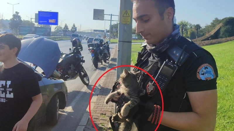 O sırada tesadüfen geçen Asayiş Şube Müdürlüğü'ne bağlı Motosikletli Polis Timleri Büro Amirliği timleri, trafiği güvenli şekilde kısa süreli durdurarak yavru kediyi aracın içinden çıkardı. Yavru kedi, aracına giren vatandaş tarafından sahiplenildi.