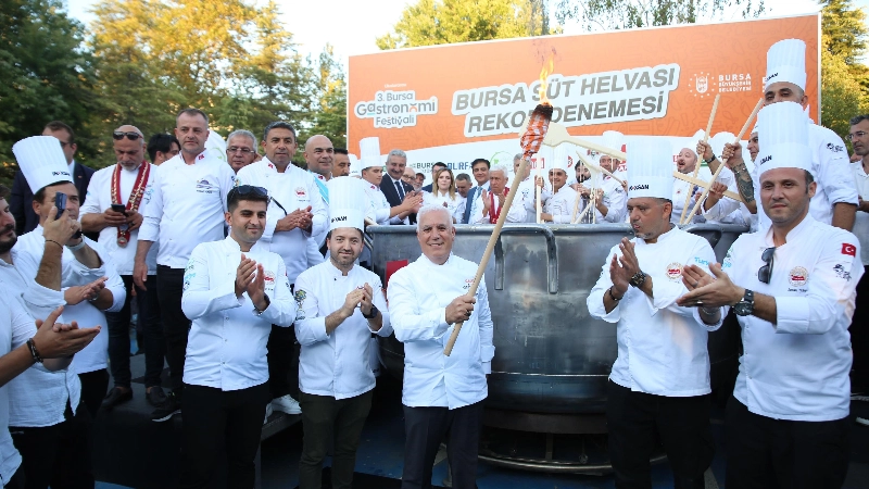 Bursa'nın sahip olduğu zengin mutfak kültürünü turizme kazandırmak ve dünyaya açmak amacıyla Büyükşehir Belediyesi tarafından ‘Damağımdaki Bursa' temasıyla düzenlenen 3. Gastronomi Festivali, birbirinden renkli rekor denemeleri ve yarışmalara da sahne oluyor. Bursa Aşçılar Derneği'nin katkılarıyla Merinos Parkı'nda Bursa'nın coğrafi işaretli tatlısı olan ‘Süt Helvası' ile rekor denemesi gerçekleştirildi. Türkiye'nin farklı kentlerinden Bursa'ya gelen 150 civarında şef, devasa kazanın başına geçerek tek seferde 5 ton süt helvasını yapmak için çalıştı. Kazanın altındaki ateşi yakan Bursa Büyükşehir Belediye Başkanı Mustafa Bozbey, eşi Seden Bozbey ile birlikte kazanın başına geçerek dev tahta kepçelerle süt helvasını karıştırdı. İlk tadımı eşi Seden Bozbey ile birlikte yapan Başkan Mustafa Bozbey, daha sonra alanı dolduran misafirlere ikramda bulundu. Rekor denemesinde emeği geçen tüm şefleri tebrik eden Başkan Bozbey, "Şeflerimiz, bu sene 5 son süt helvası yaptı. Önümüzdeki senelerde daha fazlasını yapacaklardır. Bursa'nın coğrafi işaretli tatlısı olan süt helvası, mutlaka Guinness Rekorlar Kitabı'nda yer almalıdır. Dev kazanda yapılan süt helvasını Merinos Parkı'nda ve Kent Meydanı'nda 20 bin kişiye ikram edeceğiz” dedi.