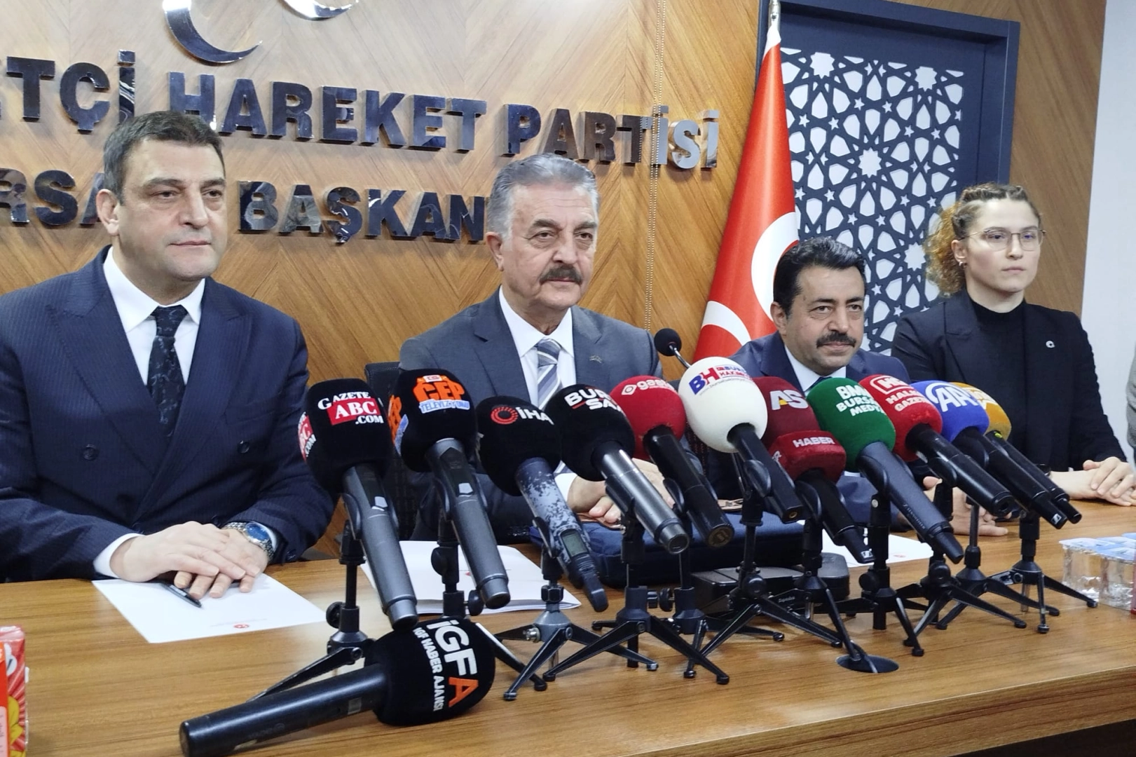 Milliyetçi Hareket Partisi (MHP), “Terörsüz Türkiye” başlığıyla Bursa İl Başkanlığı’nda basın açıklaması düzenledi. MHP Genel Sekreteri İsmet Büyükataman'ın düzenlediği toplantının ev sahipliğini İl Başkanı Muhammet Tekin yaparken toplantıya Bursa Milletvekili Fevzi Zırhlıoğlu da katıldı. Toplantıda basın mensuplarının yanı sıra MHP İl Yönetimi, İlçe Başkanları ve teşkilat mensupları da hazır bulundu.