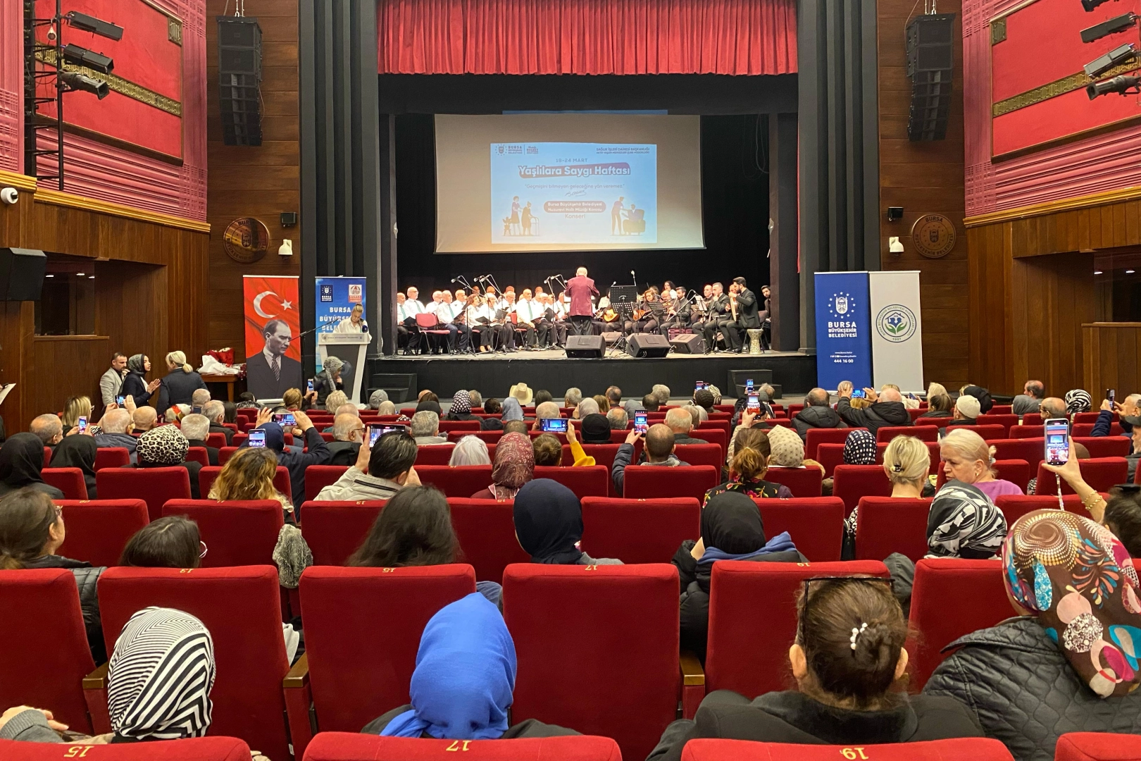 18-24 Mart tarihleri arasında kutlanan Yaşlılara Saygı Haftası kapsamında Bursa Büyükşehir Belediyesi Sağlık İşleri Dairesi Başkanlığı Aktif Yaşam Merkezleri Şube Müdürlüğü tarafından çeşitli etkinlikler düzenlendi. Heykel Atatürk Anıtı’na çelenk sunumu ile başlayan programlar, Tayyare Kültür Merkezi’ndeki sergi ve konserle devam etti. Huzurevi sakinlerinin hazırladığı eserlerin yer aldığı serginin açılışına, Büyükşehir Belediyesi Genel Sekreter Yardımcısı Mehmet Yıldız, Sağlık İşleri Dairesi Başkanı Düşünsel Şentürk, büyükşehir bürokratları ve huzurevi sakinleri katıldı. Sergiyi gezen Genel Sekreter Yardımcısı Mehmet Yıldız, eser sahiplerinden bilgi alarak çalışmalarından dolayı tebrik etti. Serginin ardından Yaşlılara Saygı Haftası etkinlikleri, ‘Huzurevi Korosu’ konseriyle sürdü. Şef Kemal Kamalı yönetiminde solo ve koro halinde eserleri seslendiren huzurevi sakinleri, sergiledikleri başarılı performansla dinleyenlerden büyük alkış aldı. Konser sonunda konuşan Genel Sekreter Yardımcısı Mehmet Yıldız, huzurevi sakinlerinin sanat yoluyla kendilerini ifade etmelerine imkan sağlayan herkese teşekkür etti. Bursa Büyükşehir Belediye Başkanı Mustafa Bozbey’in kentte yaşayan herkesin mutlu ve huzurlu olmasına büyük önem verdiğini belirten Yıldız, “Huzurevi sakinlerimiz, tecrübeleri ve birikimleriyle bizlere yol gösteriyor ve ilham kaynağı oluyor. Bursa Büyükşehir Belediyesi olarak halkımızın huzurlu, mutlu ve sağlıklı bir hayat sürdürebilmesi için hizmet etmeye devam ediyoruz” dedi.