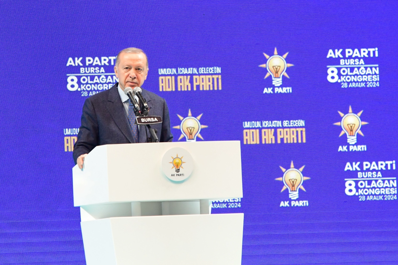 Cumhurbaşkanı Recep Tayyip Erdoğan, partisinin 8. olağan kongresinde Tofaş Spor Salonu'nda konuştu. Bursa'yı tüm ihtişamı ile tekrar ayağa kaldırmak için ulaşımdan enerjiye, çevre ve şehircilikten sağlığa kadar önemli yatırımlar yapıldığını ifade eden Erdoğan, Bursa’ya ve Bursaspor’a ayrı bir parantez açarak, “Bursa’nın tüm ihtişamıyla tekrar ayağa kalkması için güncel değerler ile 22 yılda toplam 785 milyar liralık kamu yatırımı yaptık, adalette 6 milyar lira, eğitimde 60 milyar lira, gençlik ve sporda 7 milyar lira, sosyal yardımlarda 97 milyar lira, sağlıkta 23 milyar lira, çevre ve şehircilikte 124 milyar liralık hizmeti şehrimize kazandırdık. Ulaştırmada 230 milyar lira, tarım ve ormanda 60 milyar lira, sanayi ve teknolojide 3 milyar lira, enerjide toplam 124 milyar lira, kültür ve turizmde 3 milyar lira, çalışma ve sosyal güvenlikte toplam 28 milyar lira yatırım yaptık. Bursa’da ikinci devlet üniversitesi olarak Bursa Teknik Üniversitesi'ni faaliyete aldık. 43 bin kapasiteli bir stadyum ile birlikte 86 adet spor tesisi inşa ettik. Şehrimizin en önemli markalarından biri olan Bursaspor bu yıl iyi gidiyor. Evindeki her maçını kapalı gişe oynayan takımımız muhteşem bir birliktelik yakaladı. Bursaspor, bu birliktelik sayesinde namağlup olarak ilk yarıyı lider tamamladı.” dedi.