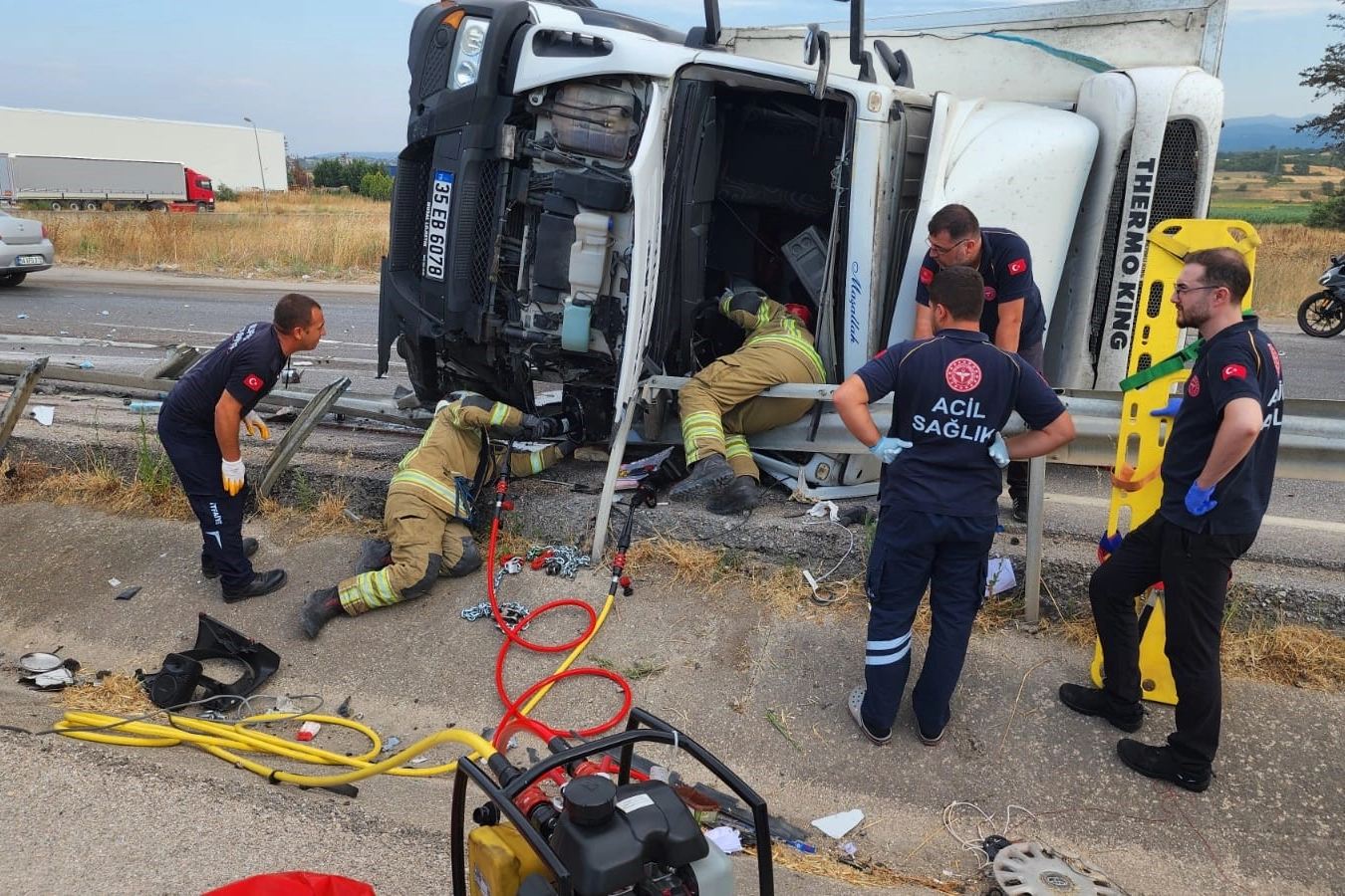 Edinilen bilgiye göre kaza, üzerinde , Mustafakemalpaşa ilçesi Güllüce Mahallesi mevkiinde meydana geldi. Bursa istikametinden Balıkesir yönüne doğru seyir halinde olan domates püresi yüklü kamyon, henüz bilinmeyen bir nedenle sürücüsünün direksiyon hakimiyetini kaybetmesi sonucu refüjü aşarak karşı şeride geçti. Karşı şeride geçen kamyon, yan yatarak durabildi. Kazada kamyon sürücüsü Y.E., aracın kabininde sıkıştı. İhbar üzerine olay yerine gelen itfaiye ekipleri, yaklaşık 50 dakikalık bir çalışmanın ardından yaralı sürücüyü sıkıştığı yerden kurtardı. Sağlık ekiplerinin kaza yerinde yaptığı ilk müdahalenin ardından Y.E., ağır yaralı olarak Mustafakemalpaşa Devlet Hastanesi'ne kaldırıldı. Kaza nedeniyle Balıkesir-Bursa istikametindeki trafik bir süre tek şeritten kontrollü olarak sağlandı. Kamyonun vinç yardımıyla kaldırılması sırasında ise yol tamamen trafiğe kapatıldı ve uzun araç kuyrukları oluştu. Kamyonun geçtiği karşı şeritte o esnada başka bir aracın bulunmaması ise facianın önüne geçti. Trafik ekipleri bölgede gerekli güvenlik önlemlerini alırken, kamyonun ve dorsesinin kaldırılmasının ardından yola saçılan domates püreleri ve bidonlar da temizlendi. Yapılan temizlik çalışmalarının tamamlanmasının ardından yol yeniden trafiğe açıldı. Kazayla ilgili inceleme başlatıldı.