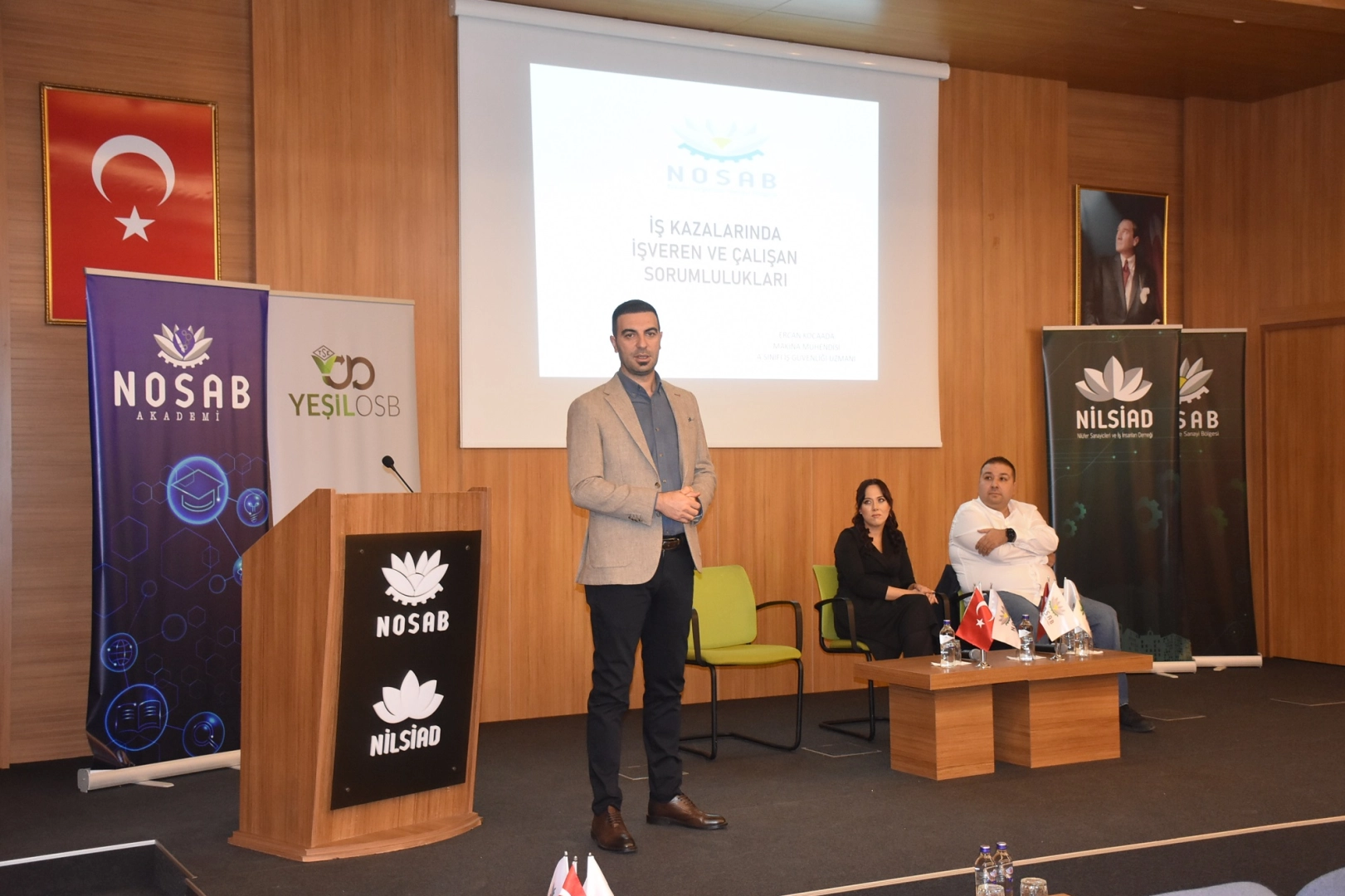 NOSAB Yönetim binası çok amaçlı toplantı salonunda gerçekleştirilen panele Makine Mühendisi – A Sınıfı İş Güvenliği Uzmanı Ercan Kocaada, Avukat – Uzman Arabulucu ve İş Sağlığı ve Güvenliği Teknikeri Elif Türk ve Yüksek Maden Mühendisi – Öğretim Görevlisi ve A Sınıfı İş Güvenliği Uzmanı Tunay Özbudak konuşmacı olarak katıldı.