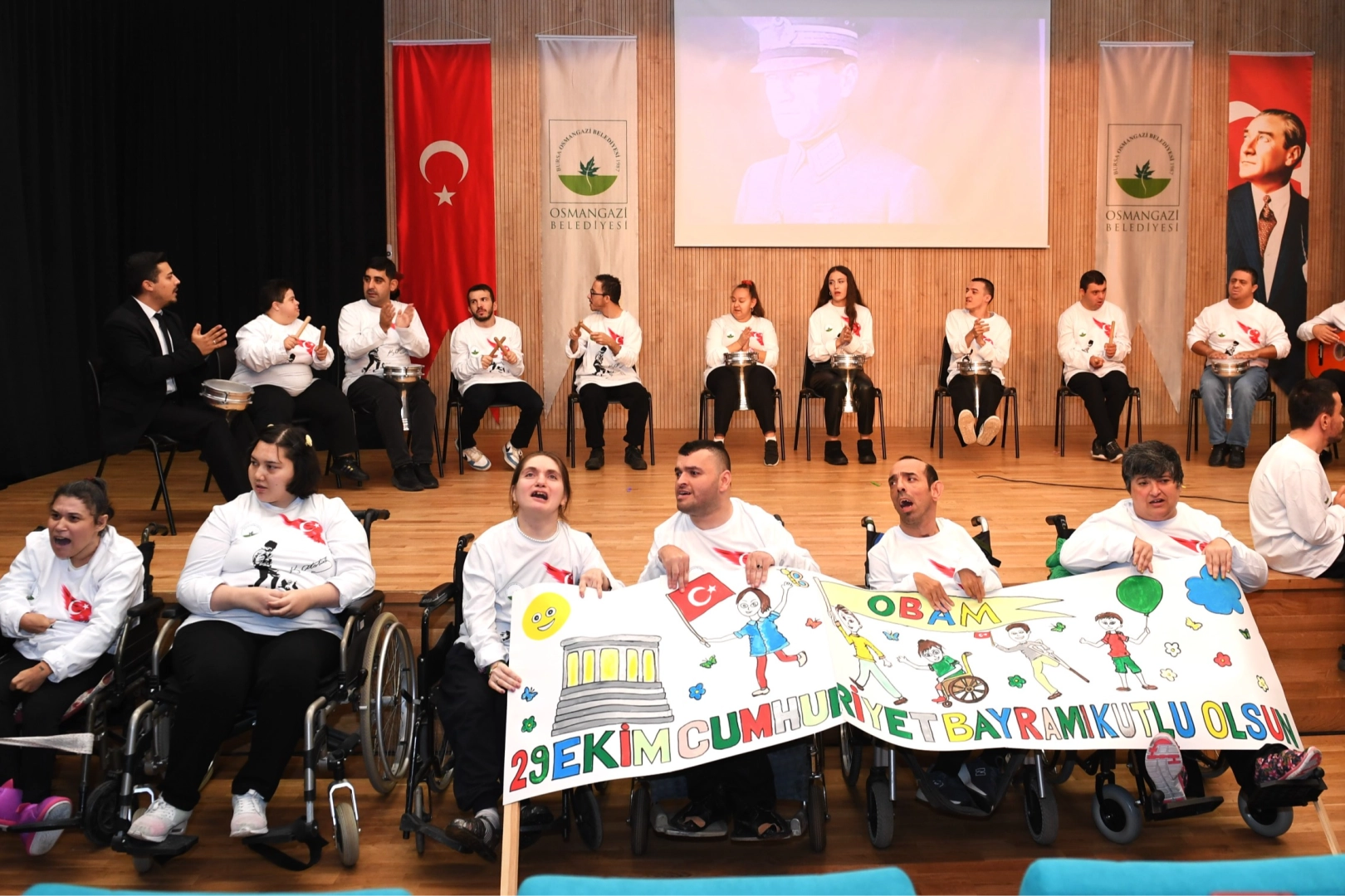 Türkiye Cumhuriyeti’nin 102’inci kuruluş yıldönümü için Osmangazi Belediyesi Engelli Bakım Merkezi (OBAM)'da eğitim gören özel gereksinimli öğrenciler, birbirinden özel gösteriler hazırladı. Osmangazi Gösteri Merkezinde düzenlenen kutlama etkinliğinde sahne alan özel öğrenciler, koro eşliğinde şarkılar söyleyip çeşitli gösteriler yaparak Cumhuriyetin 102’inci kuruluş yıldönümü büyük bir sevinç ve heyecanla kutladı.