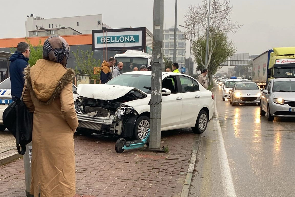 Sabahın erken saatlerinden itibaren etkisini gösteren yağış sebebiyle, Bursa-Mudanya istikametinde sürücüsünün direksiyon hakimiyetini kaybettiği otomobil bir anda yoldan çıkarak otobüs durağının hemen dibindeki elektrik direğine çarptı. Kaza anı ile birlikte durakta bekleyen vatandaşlar panik yaşarken, otomobilde büyük çaplı maddi hasar oluştu. Çevredekilerin durumu bildirmesiyle kaza alanına polis ve sağlık ekipleri sevk edildi. Yapılan ilk incelemede yaralının bulunmadığı öğrenilirken, otomobilin direğe çarparak durması duraktaki vatandaşlar için faciayı önledi. Trafik bir süre aksarken, daha sonra kontrollü bir şekilde devam etti.