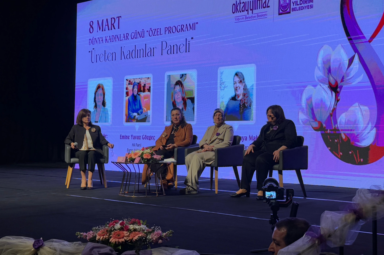 Yıldırım Belediyesi tarafından 8 Mart Dünya Kadınlar gününe özel gerçekleştirdiği programın moderatörlüğünü Ogaste.com Genel Yayın Yönetmeni Cennet Cankılıç üstlenirken, AK Parti Bursa Milletvekili Emine Yavuz Gözgeç, Çağdaş Bölme Yönetim Kurulu Başkanı Sevgi Demir ve Zeyniler Çalıkuşu Kadınlar Tarımsal Kalkınma Kooperatifi Yönetim Kurulu Başkanı Mahinur Özkaya Makar programda konuşmacı olarak yer aldı.