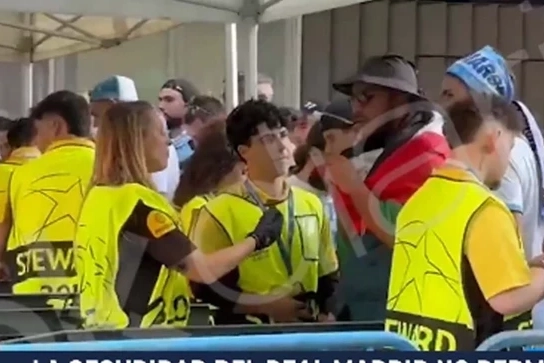 Santiago Bernabeu Stadı görevlileri, Filistin bayrağıyla stada girmeye çalışan Olimpik Marsilya taraftarlarını uyararak "Filistin bayrağıyla içeriye giremezsiniz" sözleriyle engelledi.