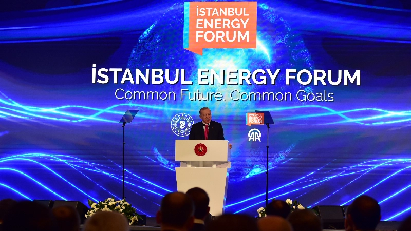 Cumhurbaşkanı Recep Tayyip Erdoğan, İstanbul Kongre Merkezi'nde düzenlenen Anadolu Ajansı İstanbul Enerji Forumu'na katıldı. "Ortak Gelecek Ortak Hedefler" temasıyla düzenlenen forumda bir konuşma yapan Cumhurbaşkanı Erdoğan, enerji, ulaştırma ve haberleşmenin özellikle birlikte kalkınmanın lokomotifi olduğunu belirterek, "Sanayileşme ve gelişmenin de temel şartı yine enerjidir. Yeterli miktarda kaliteli ve temiz enerjinin uygun fiyatlarla ve kesintisiz olarak temin edilmesi yani enerji arz güvenliği gelişmiş ve gelişmekte olan tüm ülkeler için kritik önemdedir. Yakın tarihte bölgemizde patlak veren krizler, enerji arz güvenliğinin ülke ekonomileri için ne kadar hayati olduğunu bir kez daha hatırlatmıştır. Rusya-Ukrayna arasında bininci gününü geride bırakan savaş özellikle enerji alanında dışa bağımlılığın risklerini göstermiştir. Türkiye savaşan her iki tarafla kurduğu dengeli ilişkiler sayesinde bu sancılı dönemi en rahat atlatan ülkelerden biri olmuştur. Avrupalı dostlarımız savaşın tetiklediği enerji krizini ilk elden hissettiler ve çok ciddi sıkıntılarla karşılaştılar. Şunu bir defa görmemiz gerektiğine inanıyorum. Her ne kadar günümüzde enerji arzında bir kriz yaşanmıyorsa da enerji arz güvenliğinin temini noktasında her zaman hazırlıklı olmak gereklidir. Biz de bu anlayışla enerji politikamızı çocuklarımızın çocuklarımızın emaneti olan tabiata zarar vermeden enerji arz güvenliğimizin sağlanması üzerine bina ettik. Enerjide sürdürülebilirliğin sağlanmasına, dışa bağımlılığın azaltılmasına, enerji maliyetlerimizin hafifletilmesine önem veriyoruz. Çünkü biz, etrafımızdaki birçok ülkenin aksine kullandığı enerjinin çoğunu dışarıdan satın almak mecburiyetinde olan bir ülkeyiz" dedi.