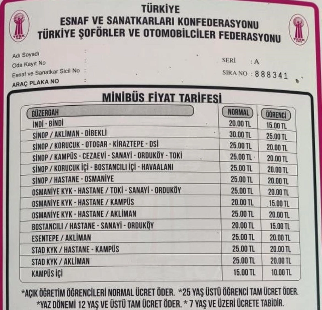 Sinop’ta toplu ulaşıma zam yapıldı. Buna göre kısa mesafe indi bindi ücreti 15,00 TL’den 20,00 TL’ye çıktı.Sinop Şoförler ve Otomobilciler Esnaf Odası, toplu taşıma araçları şehir içi fiyat tarifesinde değişikliğe gidildiğini duyurdu. Yeni tarifeye göre normal ücretlerin en düşüğü olan indi bindi ücreti tam 20,00 TL, öğrenci ise 15 TL’ye çıkartıldı.Yeni zamlı tarife ise şu şekilde:İndi-bindi tam 20,00 TL öğrenci 15 TL, Korucuk-otogar-hastane-TOKİ tam 25 TL, öğrenci 20,00 TL, Sanayi-Orduköy tam 25 TL, öğrenci 20,00 TL, Akliman tam 25,00 TL, öğrenci 20,00 TL.