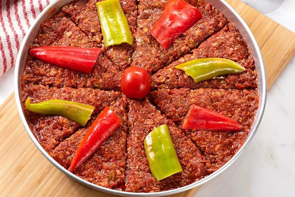 600 gr yağsız dana kıyma 1 adet kuru soğan 2adet kapya biber 3 adet yeşil biber 4 diş sarımsak 1 tutam maydanoz 1 çay kaşığı karabiber 1 tatlı kaşığı kırmızı toz biber 1 tatlı kaşığı kekik Tuz Tepsiye sürmek için;1 tatlı kaşığı domates salçası Sosu için; 1 yemek kaşığı domates salçası 1 çay bardağı su 2 yemek kaşığı sıvı yağ Yarım çay kaşığı tuz Üzerini süslemek için: Domates Yeşil biber