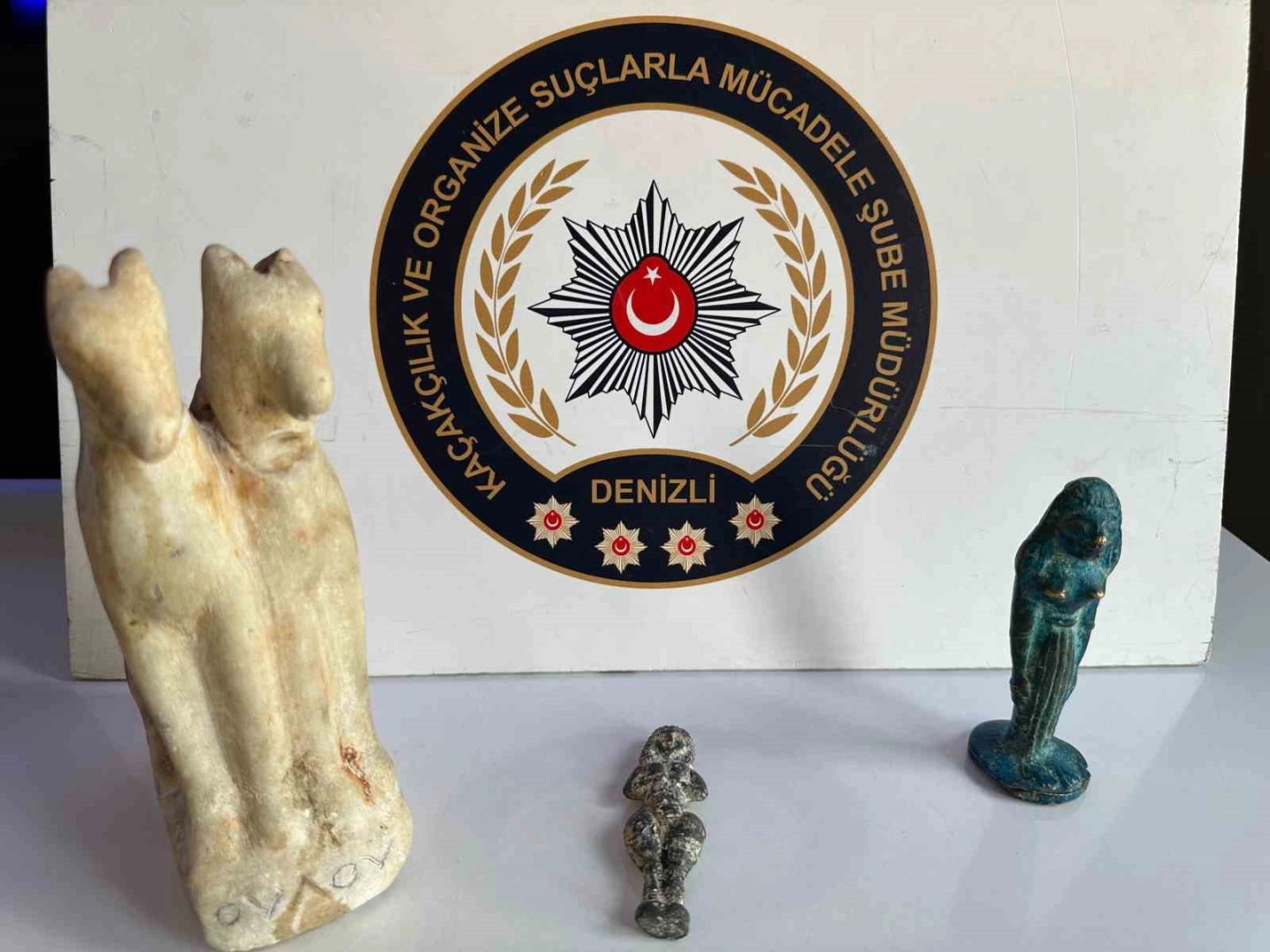 DENİZLİ (İHA) – Denizli’nin Çivril ilçesinde polis ekiplerinin düzenlediği operasyonda 3 adet tarihi eseri satmaya çalışan iki şüpheli yakalandı.Edinilen bilgiye göre; İl Emniyet Müdürlüğü Kaçakçılık ve Organize Suçlarla Mücadele Şube Müdürlüğü ile Çivril İlçe Emniyet Müdürlüğü ekipleri, tarihi eser kaçakçılığı suçunun önlenmesi amacıyla yapılan çalışmalarda, durumundan şüphelenilen bir aracı durdurdu. Şüphe üzerine durdurulan araç içerisindeki 2 şüpheli yakalanırken, araç içerisinde ve şüpheli şahısların üzerlerinde yapılan aramalarda 2863 sayılı Kültür ve Tabiat Varlıkları Koruma Kanunu kapsamında olduğu değerlendirilen 2 adet metal kadın heykeli ve 1 adet çift başlı hayvan figürlü mermer heykel ele geçirildi.Yakalanan şüpheli şahıslar hakkında “Tarihi Eser Kaçakçılığı” suçundan adli makamlarca işlem yapıldı. Olayla ilgili soruşturmanın devam ettiği bildirildi.