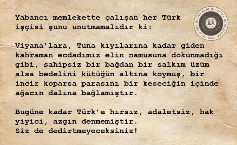 Türkiye’den 1960’lı yıllarda Almanya’ya giden işçilere pasaport başvurusu sırasında verilen ve öğütlerden oluşan liste, görenleri maziye götürüyor.Türkiye’de ekonominin sıkıntılı bir süreçten geçtiği 1960’lı yıllarda Almanya’dan gelen işçi talebi ülkenin iktisadi açıdan rahatlaması, işsizliğin azaltılabilmesi ve döviz girdisinin arttırılabilmesi için bir fırsat olarak görülmüş, Almanya’ya işçi gönderilmesine karar verilmişti. 30 Ekim 1961’de Almanya ile işçi gönderilmesine dair bir protokol imzalanmış ve toplu işgücü göçü bu protokol çerçevesinde olmuştu.O dönemde hem ekonomik sıkıntıdan kurtulmak hem de çocuklarına daha iyi bir ekonomik gelecek sağlamak amacıyla pek çok zor şartlar altına memleketten Almanya’ya gitmek zorunda kaldığını belirten Aydın Çineli Saliha Yavaş, Almanya’ya gidecek olanlara çeşitli nasihatlerde bulunulduğunu belirtti.Pasaport başvurusu sırasında Almanya’ya çalışmaya gidecek işçiler için özel hazırlanmış kağıtlarla 5 ayrı başlık altında Türk işçilere verilen nasihatlerle onur, haysiyet, aile ve ülke gururunun önemi anlatılıyor.O dönemin İş ve İşçi Bulma Kurumu Genel Müdürlüğü tarafından yurt dışına gidecek işçilere pasaport başvurusu sırasında verilen kağıtlarda yer alan öğütlerde;"Onurlu ol" başlığı altında, "Para biriktireceğim diye gerektiğinden aşağı bir şekilde yaşama, kimseden öteberi isteme, muhtaç olduğunu belli etme, kendini başkalarına acındırma, parayla olacak işleri parasız yapmaya kalkışma, cimrilik etme, kışkırtıcılara sırtını çevir" ifadeleri yer alıyor.O dönem telefon ve internet bu kadar yaygın olmadığı için "Aileni ve evini unutma" başlığı altında ise, "Evine muntazam mektup yaz, merak ettirme. Sıkıntılarını ailene yazma, tutumlu ol, paranı sokağa atma. Arttırabildiğini evine gönder" denilmiş.İşçilere verilen nasihat yazısında ayrıca, "İşini çabuk öğren ve en iyi şekilde yap. Bilmediğini sormaktan çekinme. Dikkatsizlik edip işinde malzeme zayiatına sebep olma, tembellik etme. Verilen işi zamanında ve noksansız bitir, boş ver diyene uyma, iş yerinde idarecilere, ustalara saygı göster. Kendine iyi bak, sarhoş olma, uyku saatinde uyu, uçkuruna sahip ol" denilmiş."Bayrağını düşün"Yurt dışına giden işçilere ülkenin ve Türklüğün onur ve şerefinin korunmasının öneminin de hatırlatıldığı nasihat yazısında, "Yabancı ilde yapacağın iyi iş de kötü iş de şahsına yüklenmez. Türklüğe ait olur. Bayrağının şerefini hatrından çıkarma. Rengini ataların dökülen kanlarından aldığını unutma, dinden imandan ayrılma" ifadelerine yer verilmiş.