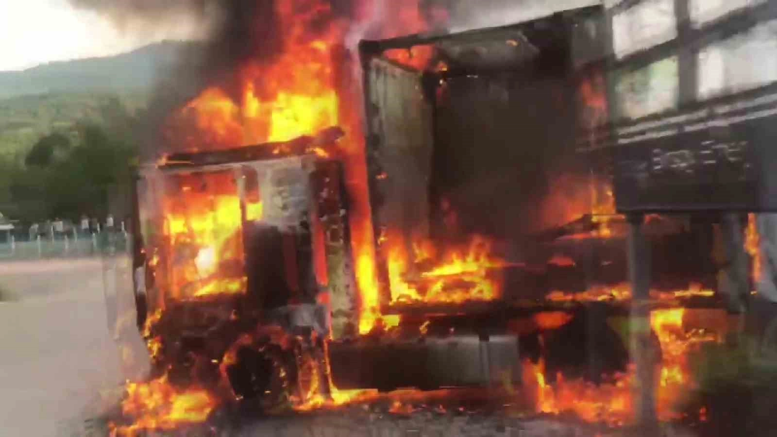 Kocaeli’nin Kartepe ilçesinde seyir halindeki tır alevlere teslim oldu. İtfaiye ekiplerinin söndürdüğü yangında tırdan geriye iskeleti kaldı.Kartepe ilçesi Maşukiye Sapanca Yolu Caddesi’nde seyir halinde olan 41 AAL 781 plakalı tırdan dumanlar yükseldi. Durumu fark eden sürücü M.T. araçtan inerken, tır kısa sürede alevlere teslim oldu. İhbar üzerine olay yerine itfaiye ve polis ekipleri sevk edildi. Kısa sürede olay yerine gelen itfaiye ekipleri, yangını söndürmek için çalışma başlattı. Ekiplerin yoğun çalışması neticesinde yangın söndürülürken, tırdan geriye iskeleti kaldı.Olayla ilgili inceleme başlatıldı.