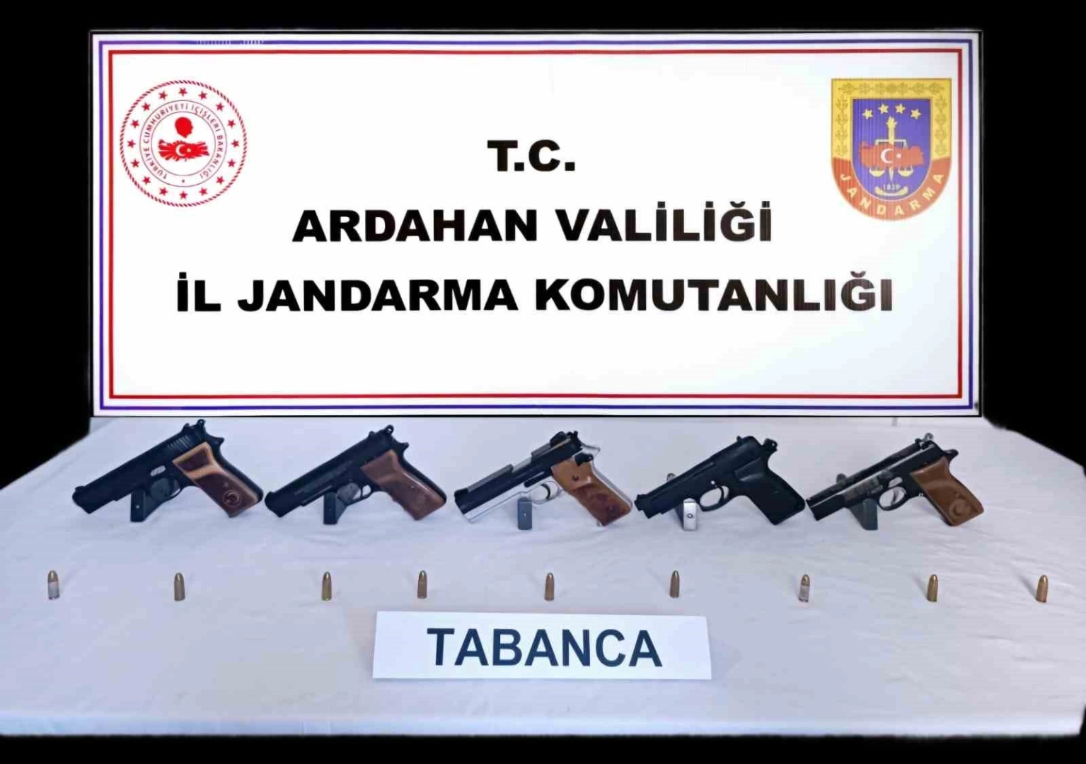 Ardahan’da jandarma ekipleri tarafından bir otomobilde yapılan aramada 5 adet ruhsatsız tabanca ile bir miktar fişek ele geçirildi. Yakalanan sürücü hakkında "ateşli silahlar kanununa muhalefet" suçundan adli işlem başlatıldı.Ardahan İl Jandarma Komutanlığı ekipleri tarafından yürütülen çalışmalar kapsamında, Göle ilçesine bağlı Çakırüzüm köyü yakınlarında durdurulan bir araçta arama çalışması yapıldı. Yapılan çalışmada otomobil içerisinde 5 adet ruhsatsız tabanca ile bir miktar fişek ele geçirildi.Silahlar ve fişeklere el konulurken, sürücü hakkında "ateşli silahlar kanununa muhalefet" suçundan adli işlem başlatıldı.