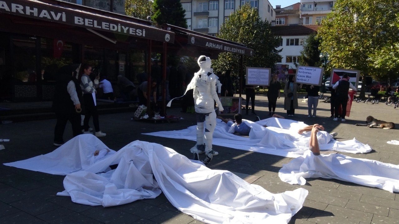 Artvin’in Arhavi ilçesinde bir grup üniversite öğrencisi, İsrail’in Filistin’e yönelik saldırılarında hayatını kaybeden çocukları anmak ve bu saldırıları kınamak için kefenli protesto düzenledi. Cami önünde bir araya gelen öğrenciler, beyaz kefenler giyerek görsel bir eylem gerçekleştirdi.Arhavi Meslek Yüksekokulu ve Artvin Çoruh Üniversitesi Güzel Sanatlar ve Tasarım Fakültesi Görsel İletişim Tasarımı Bölümü Başkanı Kemal Sağlam da protestoya katılarak öğrencilere destek verdi. Öğrenciler, savaşın çocuklar üzerindeki yıkıcı etkilerine dikkat çekerken, mağdur olan çocuklarla dayanışma mesajları verdi. ’Barış’ ve ’Adalet’ taleplerinin ön plana çıktığı eylem, çevrede toplanan vatandaşlar tarafından da ilgiyle takip edildi.Üniversite öğrencilerinin gerçekleştirdiği bu protesto, Filistin’deki savaş mağduru çocukların sesini duyurmayı ve toplumda farkındalık oluşturmayı hedefliyor.