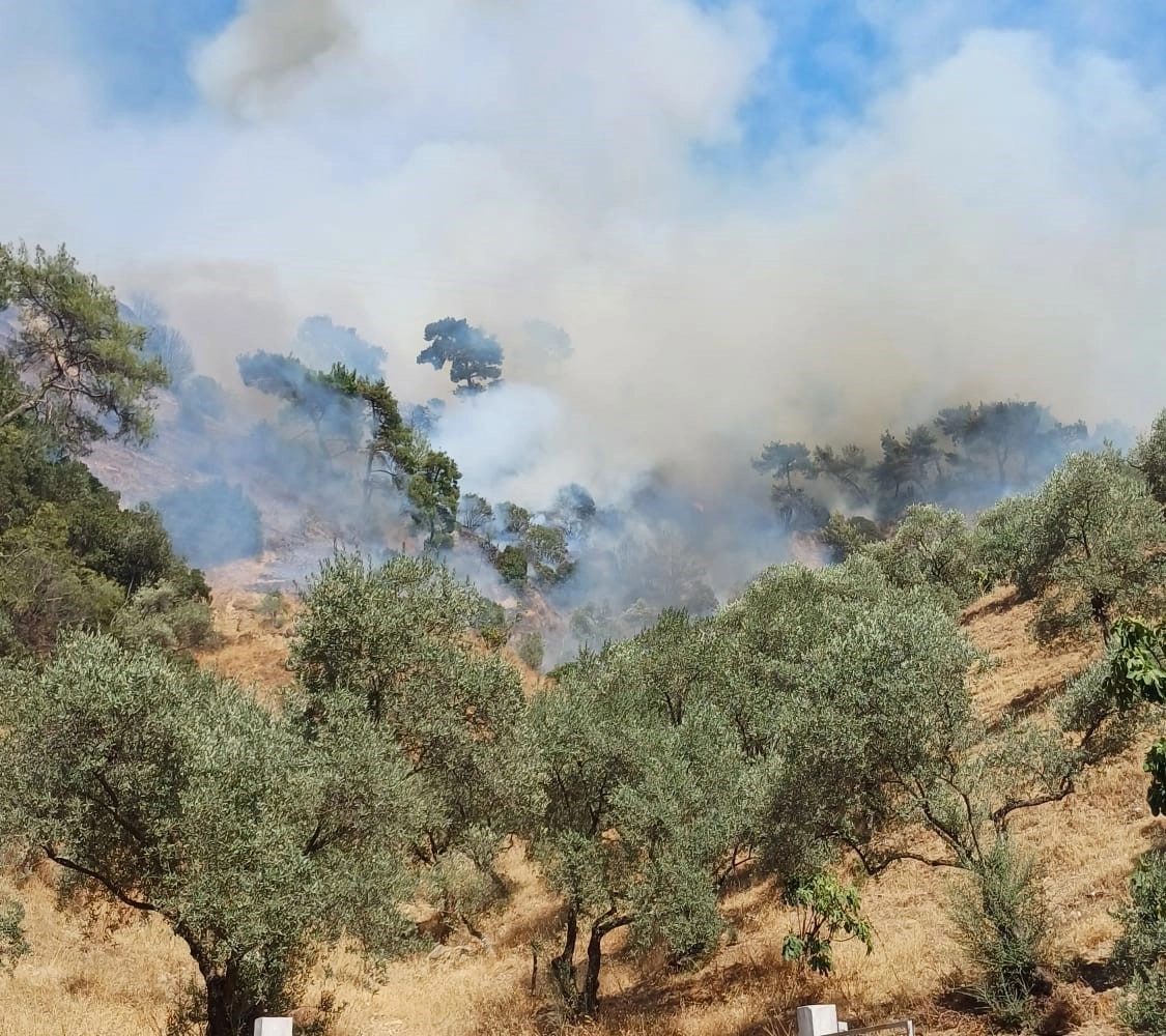Aydın’ın Efeler ilçesinde ormanlık ve zeytinlik alanda çıkan yangına havadan ve karadan müdahale devam ederken, zaman zaman alevlenen yerleri ekipler hızla söndürüyor.Efeler ilçesi Emirdoğan Mahallesi’ndeki ormanlık ve zeytinlik alanda henüz bilinmeyen bir nedenle çıkan yangın, rüzgarın etkisi ile geniş alana yayılırken, bölgede söndürme çalışmaları havadan ve karadan sürüyor. Muğla Orman İşletme Müdürlüğü’ne bağlı 4 uçak ve 4 helikopter ile havadan, 5 su ikmal aracı, 2 yer ekibi, 15 arazöz, 2 dozer, Aydın Büyükşehir Belediyesi’ne ait 4 su tankeri, Efeler Belediyesi’ne ait 3 su tankeri, 4 itfaiye aracı ve arazözü ile karadan müdahale devam ediyor. Zaman zaman alevlenen bölgelere hızla müdahale eden ekipler, yangının kontrol altına alınması için yoğun çaba sarf ediyor. Bölgede söndürme ve soğutma çalışmaları devam ederken, bölgedeki vatandaşlar da ekiplere destek veriyor.