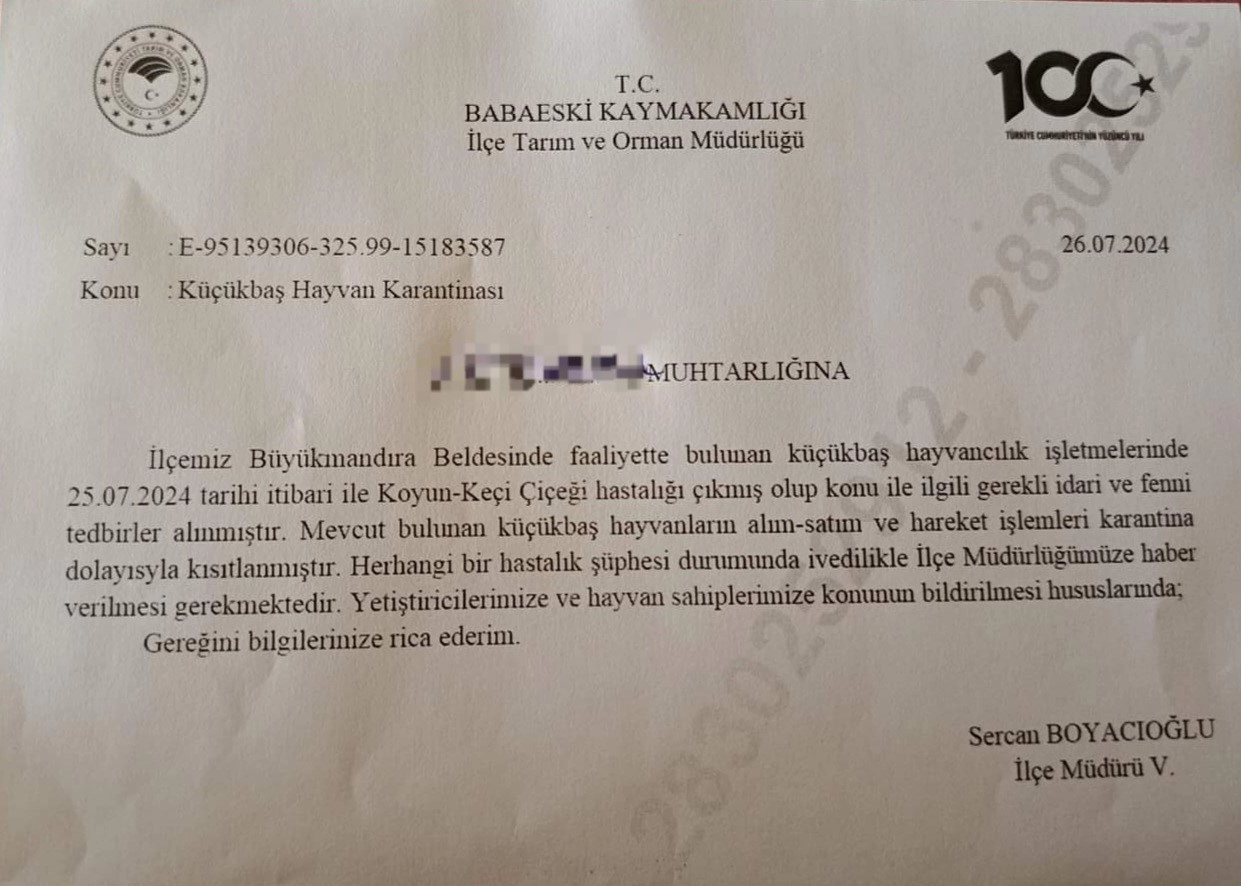 Kırklareli’nin Babaeski ilçesinde küçükbaş hayvanlarda çiçek hastalığı belirtilerinin görüldüğü bildirildi.Babaeski ilçesine bağlı Büyükmandıra beldesinde koyun ve keçilerde tespit edilen çiçek hastalığı nedeniyle ilçede hayvan hareketlerine ve ürünlerin kısıtlama getirildi. Konu ile ilgili Babaeski İlçe Tarım ve Orman Müdürlüğü’nden yapılan açıklamada şu ifadelere yer verildi.“İlçemiz Büyükmandıra beldesinde faaliyette bulunan küçükbaş hayvancılık işletmelerinde 25 Temmuz 2024 tarihi itibari ile koyun-keçi çiçeği hastalığı çıkmış olup konu ile ilgili gerekli idari ve fenni tedbirler alınmıştır. Mevcut bulunan küçükbaş hayvanların alım-satım ve hareket işlemleri karantina dolayısıyla kısıtlanmıştır. Herhangi bir hastalık şüphesi durumunda ivedilikle İlçe Müdürlüğümüze haber verilmesi gerekmektedir”.