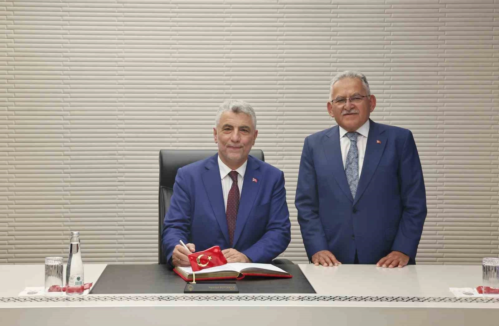 Ticaret Bakanı Prof. Dr. Ömer Bolat, AK Parti Genel Başkan Vekili Mustafa Elitaş ile birlikte Kayseri Büyükşehir Belediye Başkanı Dr. Memduh Büyükkılıç’ı makamında ziyaret etti.Kayseri Büyükşehir Belediye Başkanı Dr. Memduh Büyükkılıç, bir dizi program dolayısıyla kente gelen Ticaret Bakanı Prof. Dr. Ömer Bolat ve beraberindeki heyeti, makamında ağırladı. Başkan Büyükkılıç, Ticaret Bakanı Prof. Dr. Ömer Bolat’ı kapıda çiçeklerle karşıladı. Bakan Bolat’a ziyarette AK Parti Genel Başkan Vekili Mustafa Elitaş, Kayseri Valisi Gökmen Çiçek, Ticaret Bakan Yardımcıları Özgür Volkan Ağar ve Mahmut Gürcan, AK Parti Kayseri Milletvekili Bayar Özsoy, AK Parti Kayseri İl Başkanı Fatih Üzüm ve AK Parti Kayseri İl Kadın Kolları Başkanı Meral Koşar, AK Parti Kayseri İl Gençlik Kolları Başkanı Hayri Danacı eşlik etti.Başkanlık makamında gerçekleşen ziyarette Başkan Büyükkılıç, Bakan Bolat’a hem ziyaretleri hem de Kayseri’ye göstermiş oldukları sıcak ve samimi ilgilerinden dolayı teşekkür etti. Büyükkılıç, Bakan Bolat’a kentte yapılan yatırımlar, hizmetler ve projeler ile ilgili detaylı bilgi de verdi.Kayseri’de bulunmaktan dolayı duyduğu memnuniyeti dile getiren Bakan Bolat da ev sahipliğinden dolayı Başkan Büyükkılıç’a teşekkür etti.Sanayi ve ticaret şehri Kayseri’nin önemine işaret eden ve Şeref Defteri’ni imzalayan Ticaret Bakanı Prof. Dr. Ömer Bolat, tüm Kayserililere de selam ve sevgilerini iletti.