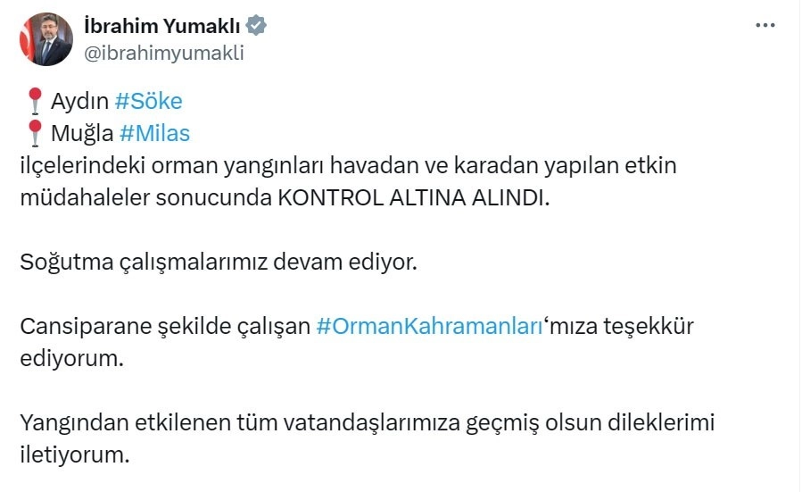 Tarım ve Orman Bakanı İbrahim Yumaklı Muğla ve Aydın’daki orman yangınlarının kontrol altına alındığını belirterek orman kahramanlarına gösterdikleri çabadan dolayı teşekkür etti.Aydın’ın Söke ve Muğla’nın Milas ilçelerinde dün başlayan orman yangınları ekiplerin havadan ve karadan yoğun çalışmaları sonucu kontrol altına alındı. Tarım ve Orman Bakanı İbrahim Yumaklı sosyal medya hesabından yaptığı paylaşımla Muğla Orman Bölge Müdürlüğü ekiplerine teşekkür ederken, yangından etkilenen vatandaşlara da geçmiş olsun dileklerini iletti.Bakan Yumaklı yaptığı paylaşımda, "Aydın’ın Söke ve Muğla’nın Milas ilçelerindeki orman yangınları havadan ve karadan yapılan etkin müdahaleler sonucunda kontrol altına alındı. Soğutma çalışmalarımız devam ediyor. Cansiparane şekilde çalışan #OrmanKahramanları‘mıza teşekkür ediyorum. Yangından etkilenen tüm vatandaşlarımıza geçmiş olsun dileklerimi iletiyorum" ifadelerini kullandı.