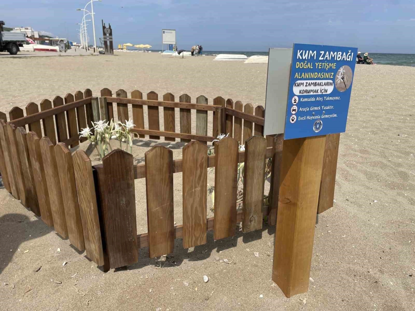 Bursa sahillerinde yetişen ve dünyada nadir rastlanan kum zambakları, Bursa Büyükşehir Belediyesi ekipleri tarafından çitlerle çevrilerek koruma altına alındı.Dünya Doğa Koruma Birliği tarafından dünyada nadir rastlanması ve neslinin tükenme tehlikesi nedeniyle koruma altına alınan ’kum zambağı’ (Pancratium maritimum), Bursa sahillerinin çeşitli bölgelerinde doğal şekilde yetişiyor. Özellikle Temmuz ve Ağustos aylarında çiçek açarak sahilleri süsleyen kum zambakları, Bursa Büyükşehir Belediyesi Park ve Bahçeler Dairesi Başkanlığı Sahil Planlama ve Yapım Şube Müdürlüğü ekipleri tarafından koruma altına alındı. Kum zambaklarının etrafını çitlerle çeviren ve uyarı levhaları koyan ekipler, sahillerin farklı noktalarına da bilgilendirici yazılar asarak nadide bitkilere karşı duyarlılığı arttırıyor. Yetkililer, koruma altındaki bitkileri koparmanın cezasının 387 bin 141 TL olduğunu da hatırlattı.Park ve Bahçeler Daire Başkanı Hakan Tanrıöver, Uluslararası Dünya Doğayı Koruma Birliği’nce dünyada nadir rastlanması ve neslinin tükenme tehlikesi nedeniyle koruma altına alınan kum zambaklarının Eğerce Halk Plajı kumsallarında yetiştiğini söyledi. Kumun bir yerden bir yere taşınmasına da kum zambaklarının engel olduğunu belirten Tanrıöver, “Sahil Planlama Şube Müdürlüğü tarafından koruma altına alınan zambaklarımızın etrafını ahşap çitlerle çevirdik. Hem uyarı levhaları asıyoruz hem de vatandaşlarımızın bilinçlenmesini sağlıyoruz. Nadir görülen ve koruma altına alınan zambakların, plajlarımızı kullanan vatandaşlarımız tarafından korunmasını rica ediyoruz” dedi.