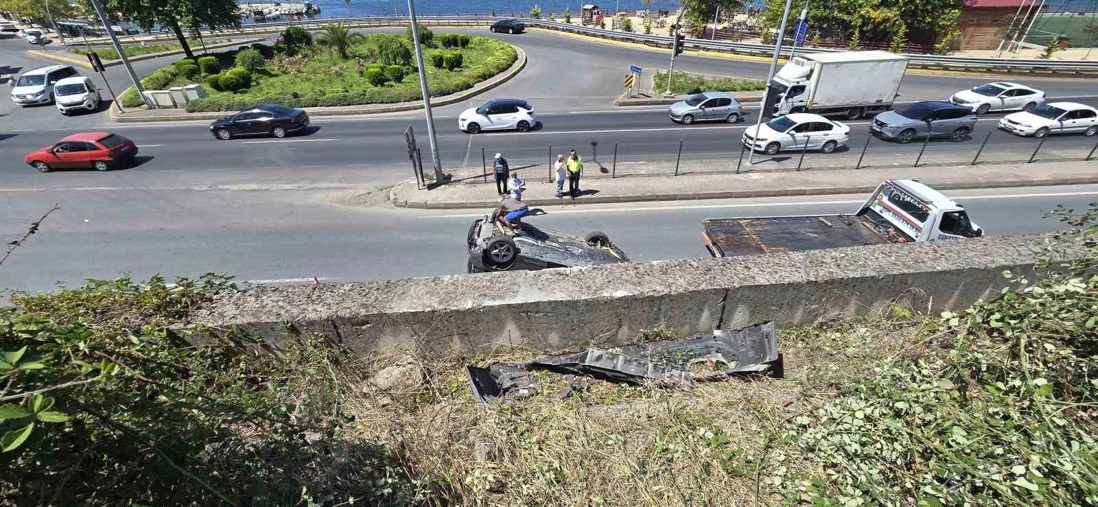 KOCAELİ (İHA) – Kocaeli’nin Gölcük ilçesinde garaj kapısını kapatmak için sürücünün indiği otomobil 6 metre yükseklikten D130 Karayolu’na uçtu. Otomobil takla atarken, araçta bulunan yolcu yaralandı.Olay, Halıdere Yalı Mahallesi Taşlıburun Caddesi’nde meydana geldi. İddiaya göre, sürücü A.K., garajdan 41 AK 599 plakalı otomobilini çıkarttı. Çalışır vaziyetteki aracından inen A.K., garajın kapısını kapatmak için otomobilden indi. O esnada kendi kendine hareket eden otomobil, 6 metre yükseklikten D-130 Karayolu’na uçarak takla attı. O esnada araçta yolcu kısmında bulunan kadın yaralandı. Kazayı gören vatandaşlar hem 112 Acil Çağrı Merkezine haber verdi hem de yardıma koştu. Vatandaşlar araçta bulunan kadını çıkarırken olay yerine sağlık, polis ve itfaiye ekipleri sevk edildi. Kısa sürede olay yerine gelen sağlık ekipleri, yaralı kadını ambulansla hastaneye kaldırdı.Kaza sebebiyle uzun araç kuyrukları oluştu. Aracın yoldan kaldırılmasıyla trafik eski seyrine döndü. Polis olayla ilgili inceleme başlattı.